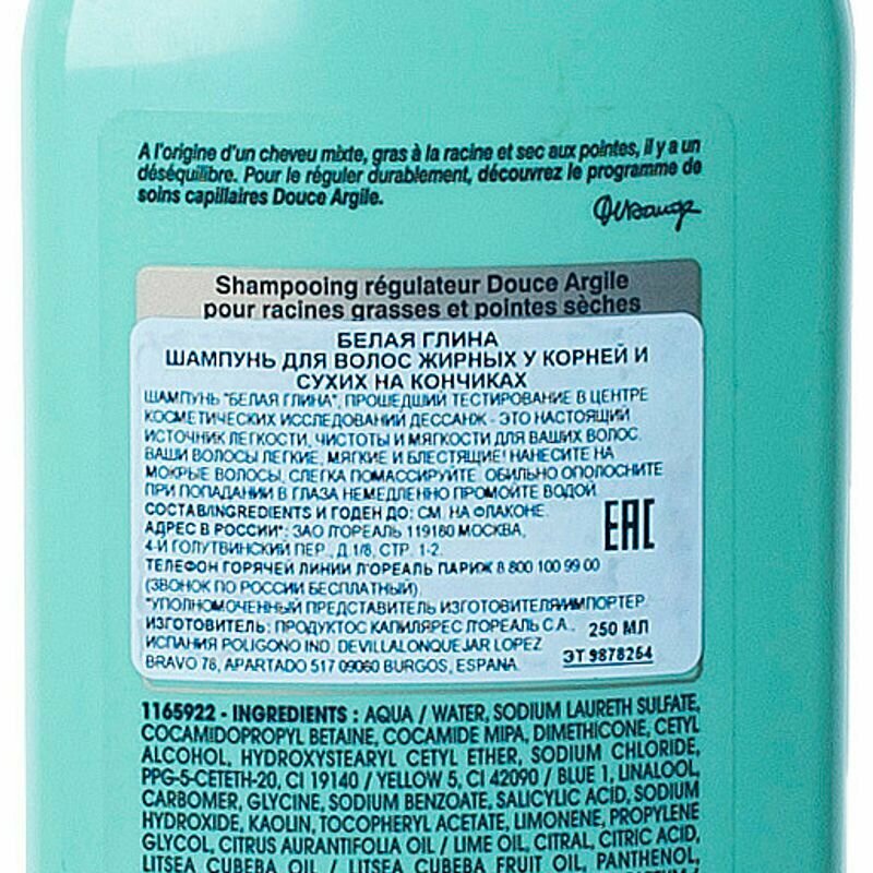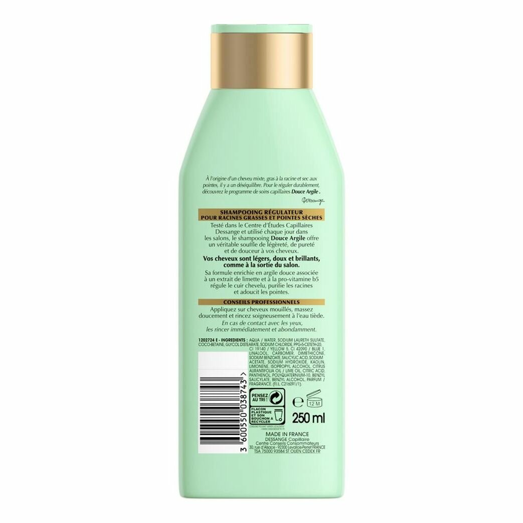 Шампунь для волос Белая Глина от Dessange предназначен для очищения волос жирных у корней, но сухих на кончиках. Благодаря сбалансированному составу, присутсвию белой глины и сладкого лимона, он эффективно очищает волосы и кожу головы, регулирует работу сальных желез, подсушивает и успокаивает кожу, а также питает и смягчает кончики волос за счет про-витамина В5. В результате баланс кожи головы восстанавливается, волосы становятся живыми и гладкими от корней до самых кончиков.