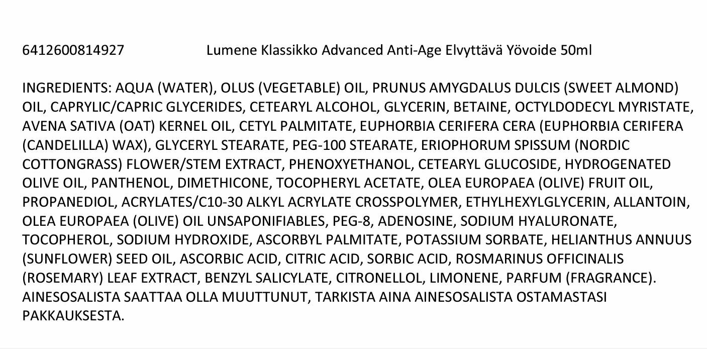Состав ночного антивозрастного питательного крема Lumene Klassikko богат ухаживающими маслами. Среди них есть: