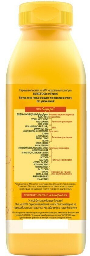 | Состав | Aqua/water, cetearyl alcohol, glycerin, isopropyl myristate, stearamidopropyl dimethylamine, musa paradisiaca fruit juice/banana fruit juice, glycine soja oil / soybean oil, helianthus annuus seed oil / sunflower seed oil, cocos nucifera oil/coconut oil, sodium hydroxide, coco-caprylate/caprate, hydroxypropyl guar hydroxypropyltrimonium chloride, caprylyl glycol, citric acid, lactic acid, tartaric acid, cetyl esters, potassium sorbate, sodium benzoate, salicylyc acid, linalool, benzyl alcohol, parfum / fragrance |
