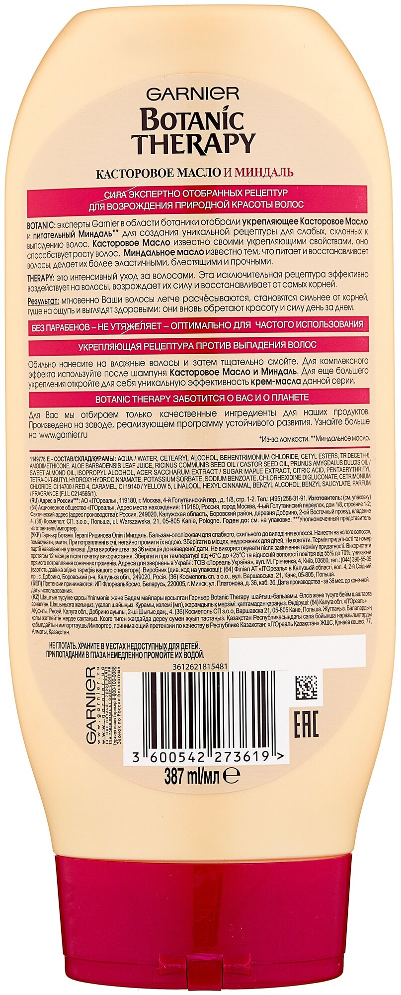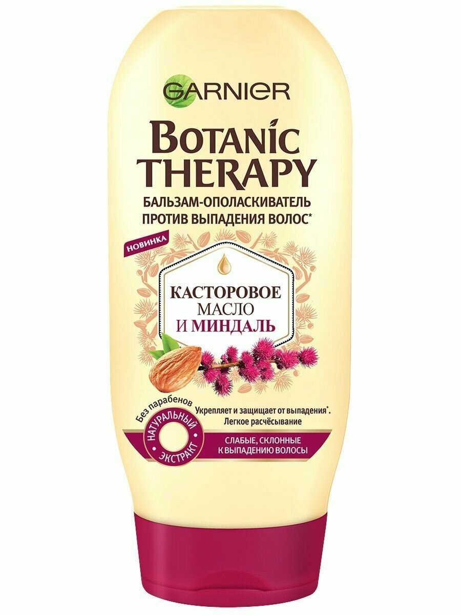 BOTANIC: эксперты Garnier в области ботаники отобрали укрепляющее Касторовое Масло и питательный Миндаль для создания уникальной рецептуры для слабых, склонных к выпадению волос. Касторовое Масло известно своими укрепляющими свойствами, оно способствует росту волос. Миндальное масло известно тем, что питает и восстанавливает волосы, делает их более эластичными, блестящими и прочными. THERAPY: это интенсивный уход за волосами. Эта исключительная рецептура эффективно воздействует на волосы, возрождает их силу и восстанавливает от самых корней.