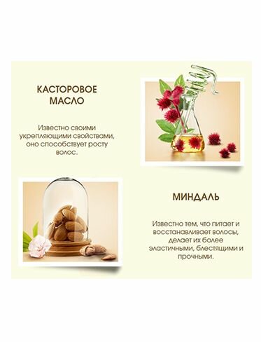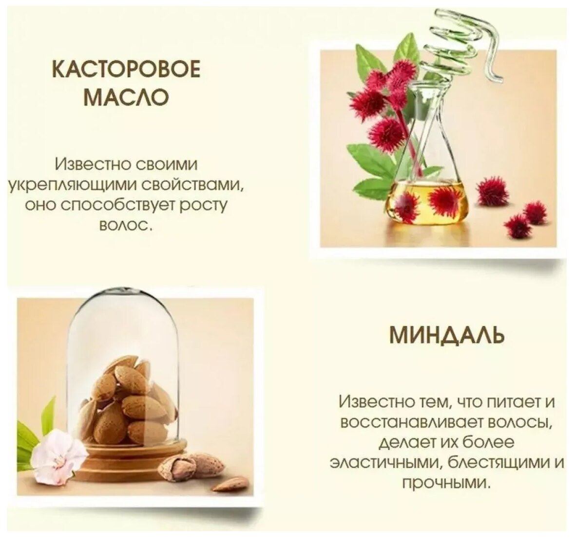 Касторовое Масло известно своими укрепляющими свойствами, оно способствует росту волос. Миндальное масло известно тем, что питает и восстанавливает волосы, делает их более эластичными, блестящими и прочными.