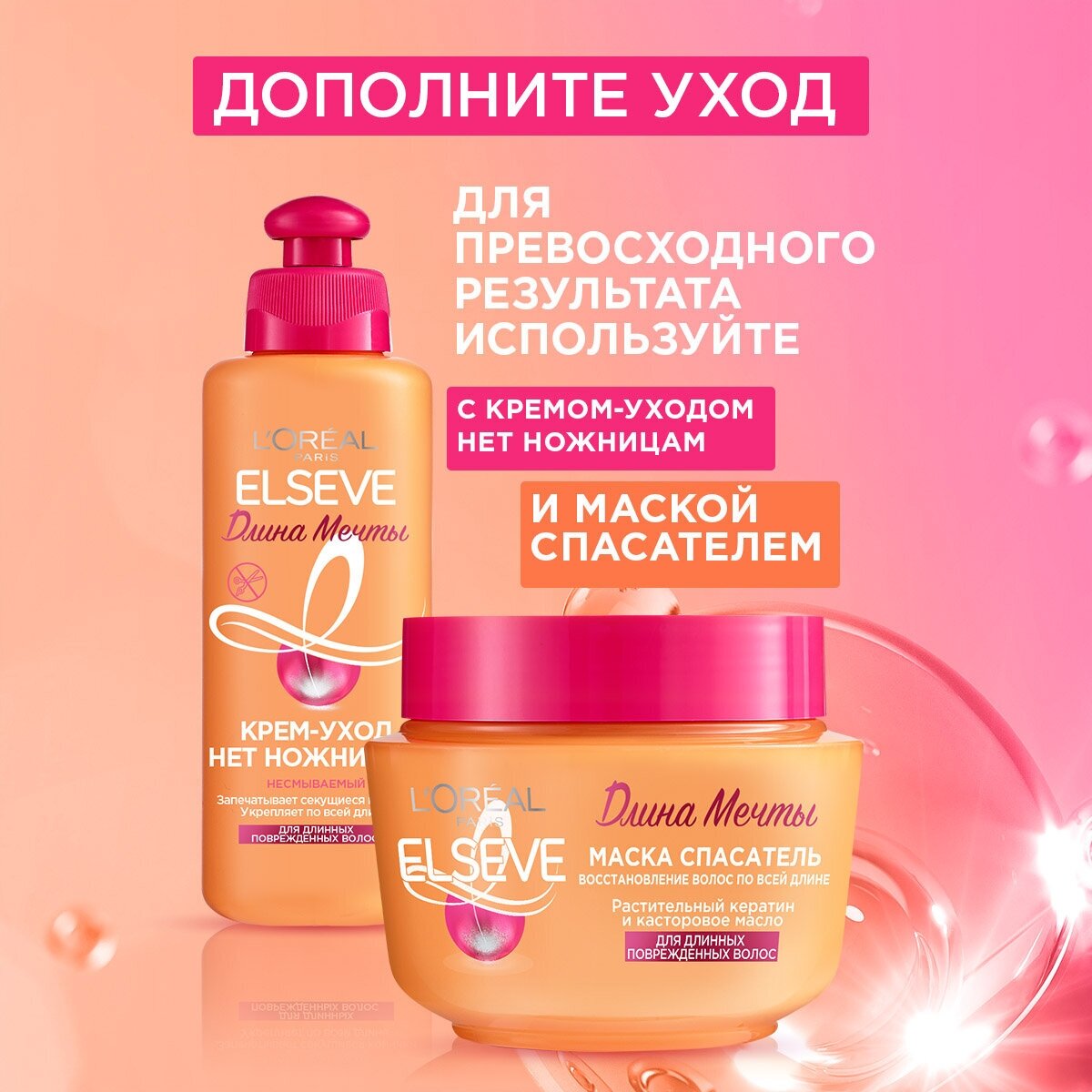 • Для идеального результата используйте также с Супербальзамом Легкое Расчесывание и Кремом-Уходом Нет Ножницам гаммы Длина Мечты.