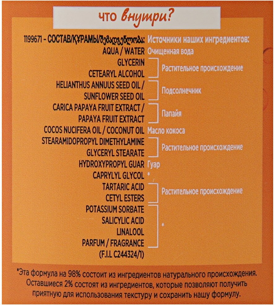 | Состав | aqua, glycerin, cetearyl alcohol, helianthus annuus seed oil, sunflower seed oil, capica papaya fruit extract, papaya fruit extract, cocos nucifera oil, coconut oil, stearamidopropyl dimethylamine, glyceryl stearate, hydroxypropyl guar, caprylyl glycol, tartaric acid, cetyl esters, potassium sorbate, salicylic acid, linalool, parfum, fragrance |
