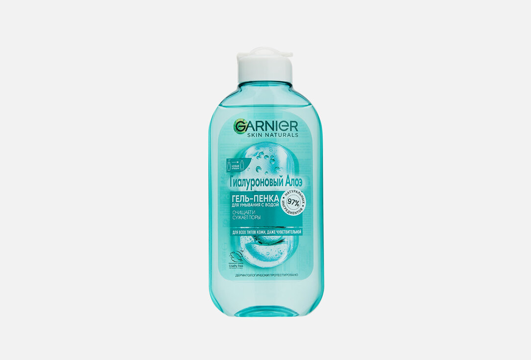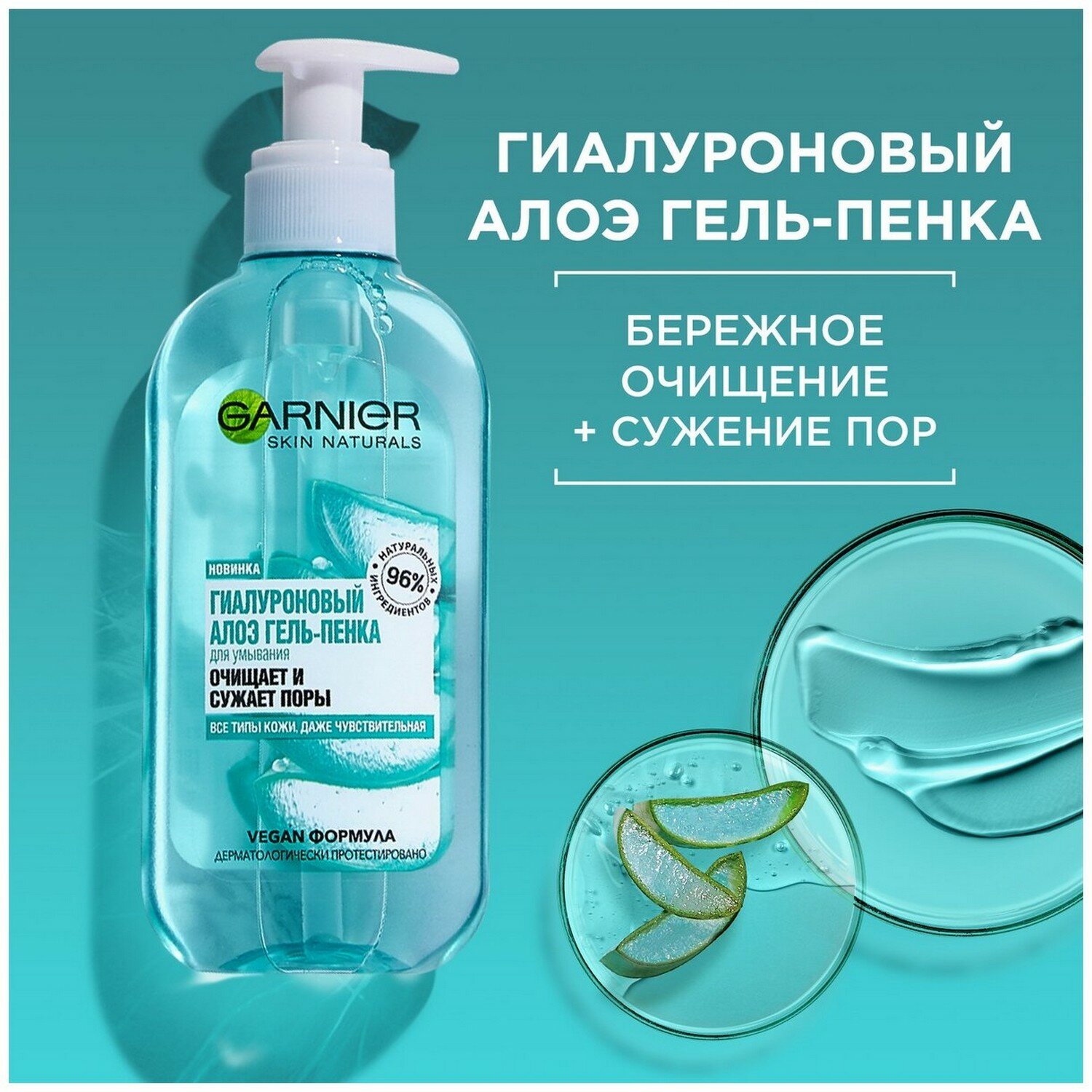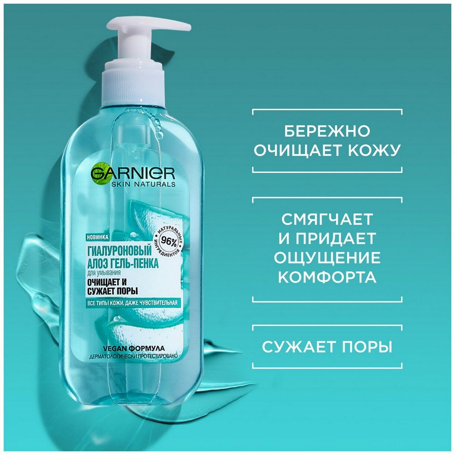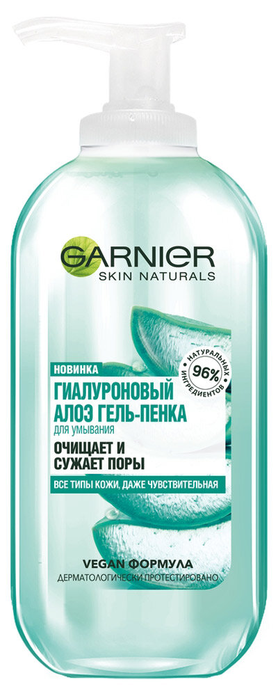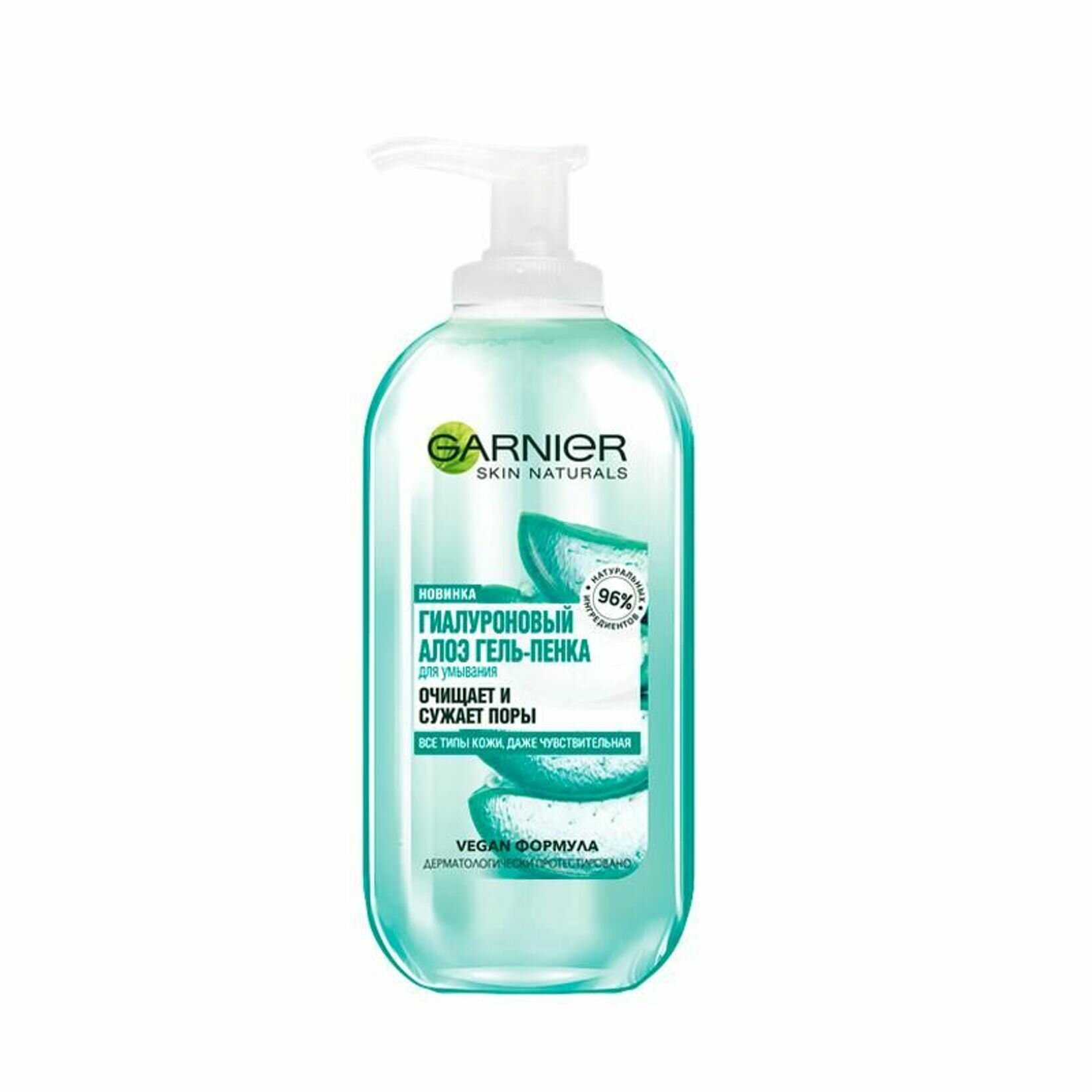 Garnier Skin Naturals Гиалуроновый Алоэ Гель-пенка для умывания обогащен органическим Алоэ Вера и Гиалуроновой кислотой, удаляет излишки кожного жира и загрязнения, делает поры менее заметными.