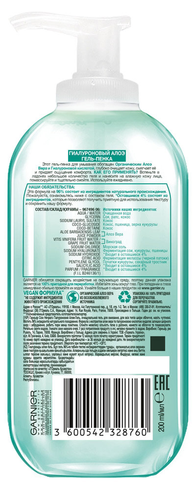 Garnier Гиалуроновый Алоэ Гель-пенка для умывания 200 мл (Garnier ) (C6395300)