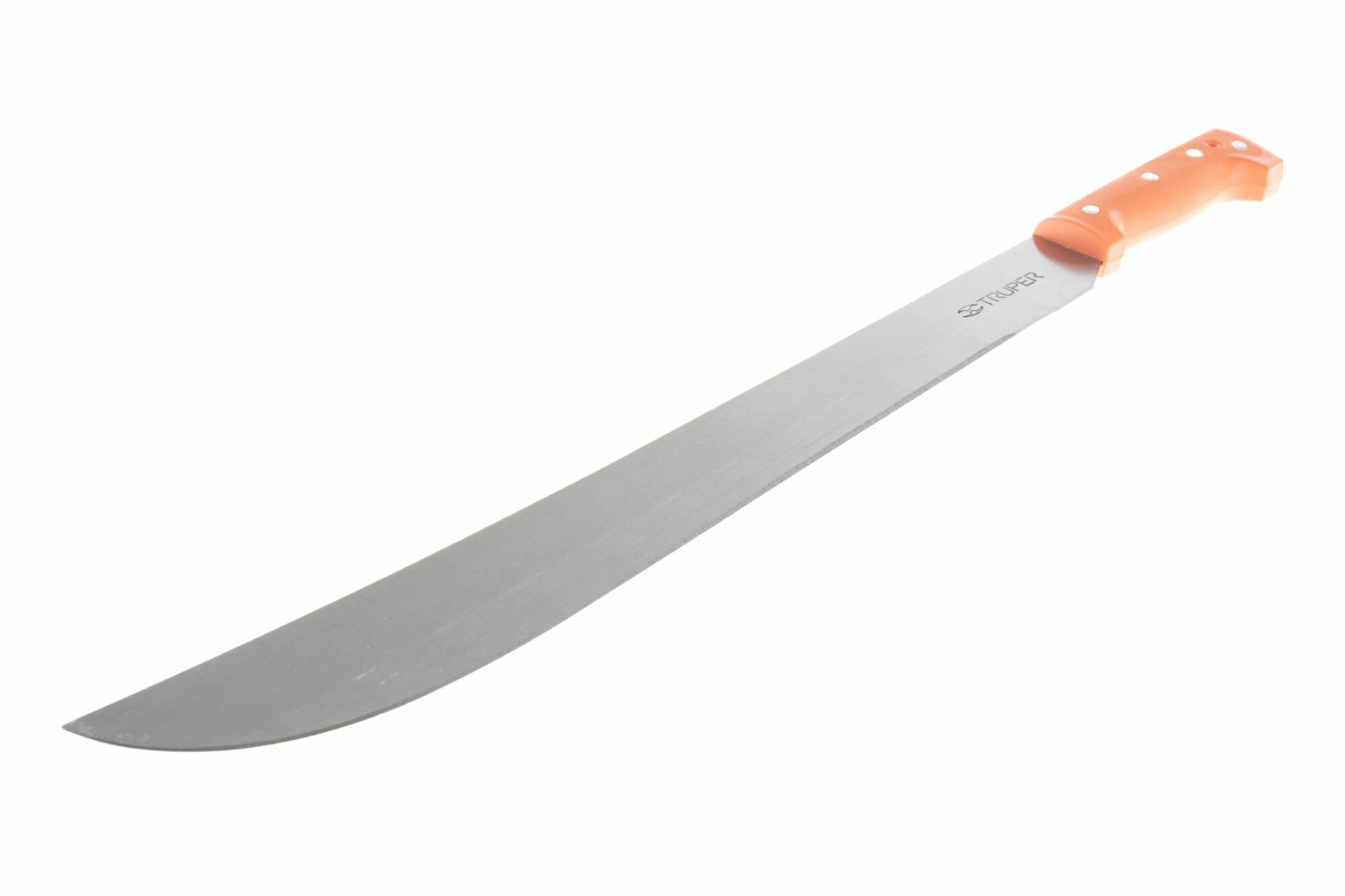 Мачете представляет собой прочную и надежную конструкцию, состоящую из удобной ручки и стальной рабочей части.