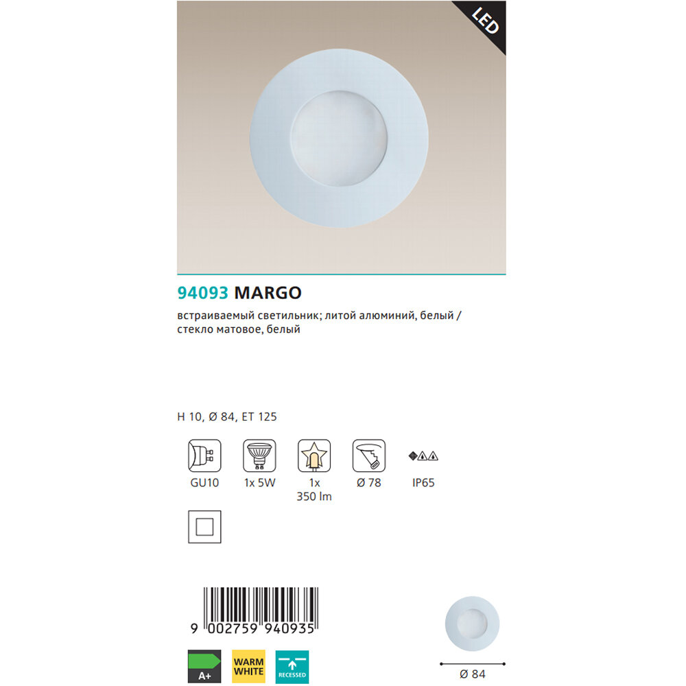 Встраиваемый светильник уличный Margo - продукт известной компании Eglo (Австрия). Имеет максимальную мощность 5 Вт, освещает площадь до 1 кв. м. Отлично подойдет для таких мест, как сад, дача, веранда и беседка. Впишется в интерьеры следующих стилей: модерн, техно, минимализм.