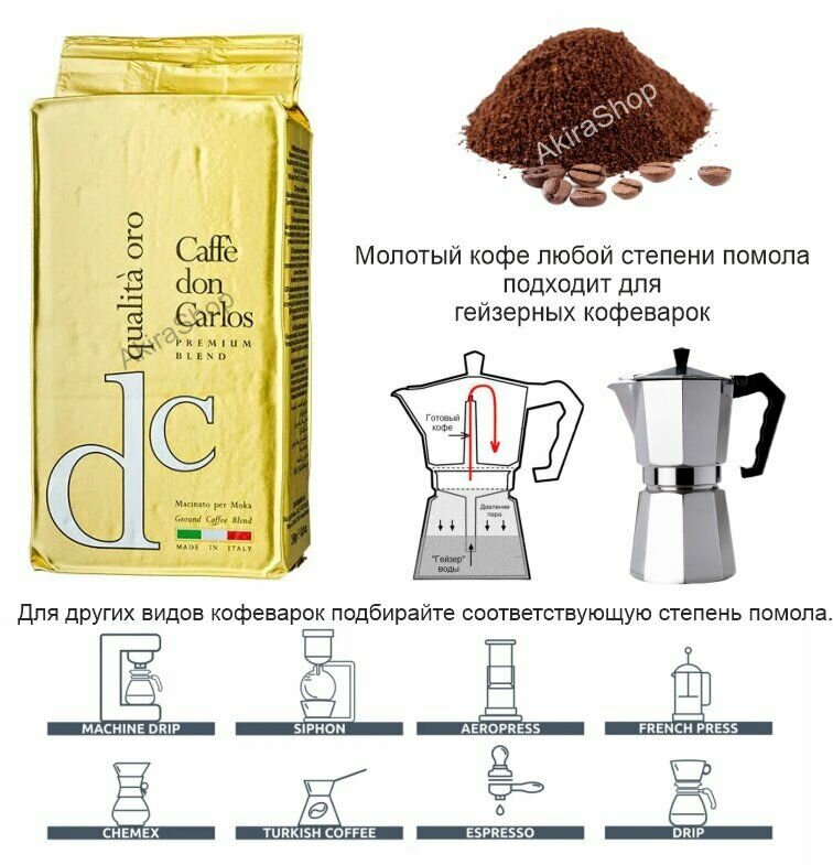 Молотый кофе готовить классическим способом в кофемашине эспрессо, кофемашине американо, гейзерной кофеварке, турке или френч-прессе.