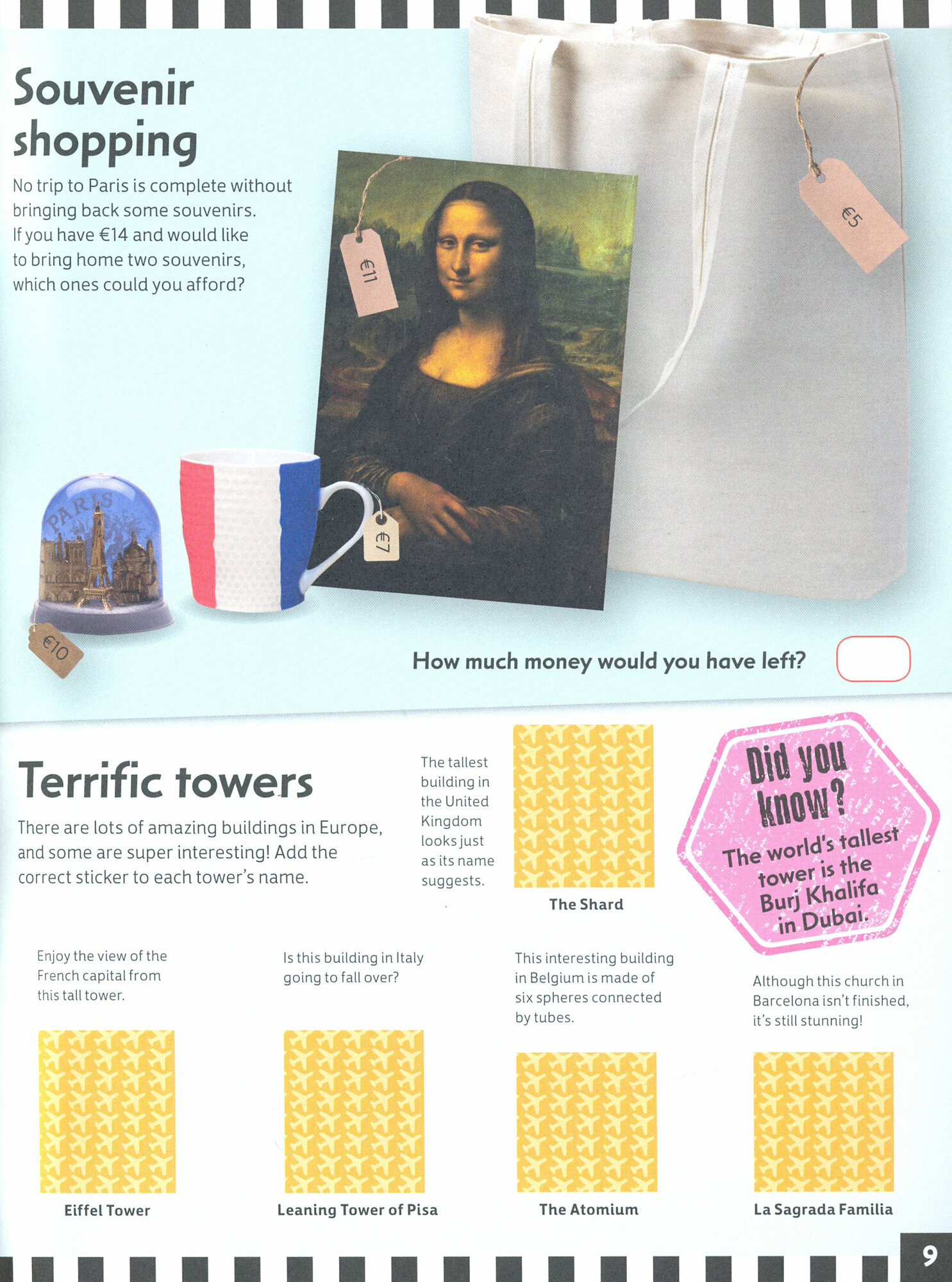 This activity book is crammed with more than 300 reusable stickers to use in the activities (and lots of extras for fun), as well as more than 35 games, including completing a sticker puzzle of Mt Fuji, finishing the second half of the Taj Mahal, solving the statue anagram, and much more.