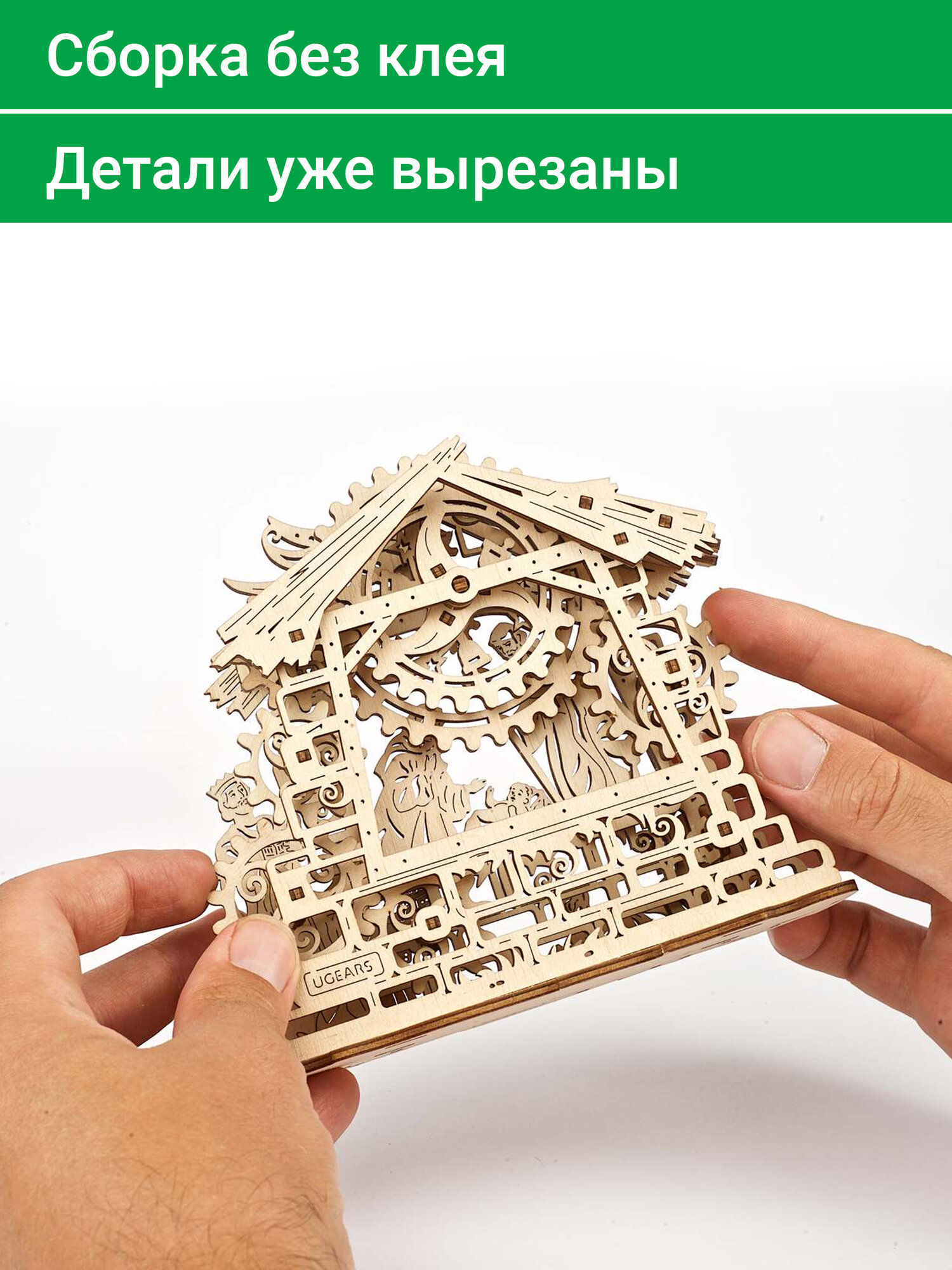 Разрабатывая конструктор, Ugears создавали модель для всей семьи, в сборке которой будет интересно участвовать и взрослым, и детям. Рождественский Вертеп Ugears – прекрасный предмет рождественского декора с элементами механики, приводящей в движение некоторые элементы сцены. Чтобы запустить механизм, покрутите вручную любое из зубчатых колес наверху или по сторонам модели. Звезда на крыше яслей начнет двигаться вместе с остальными резными шестеренками, анимируя фон сцены.