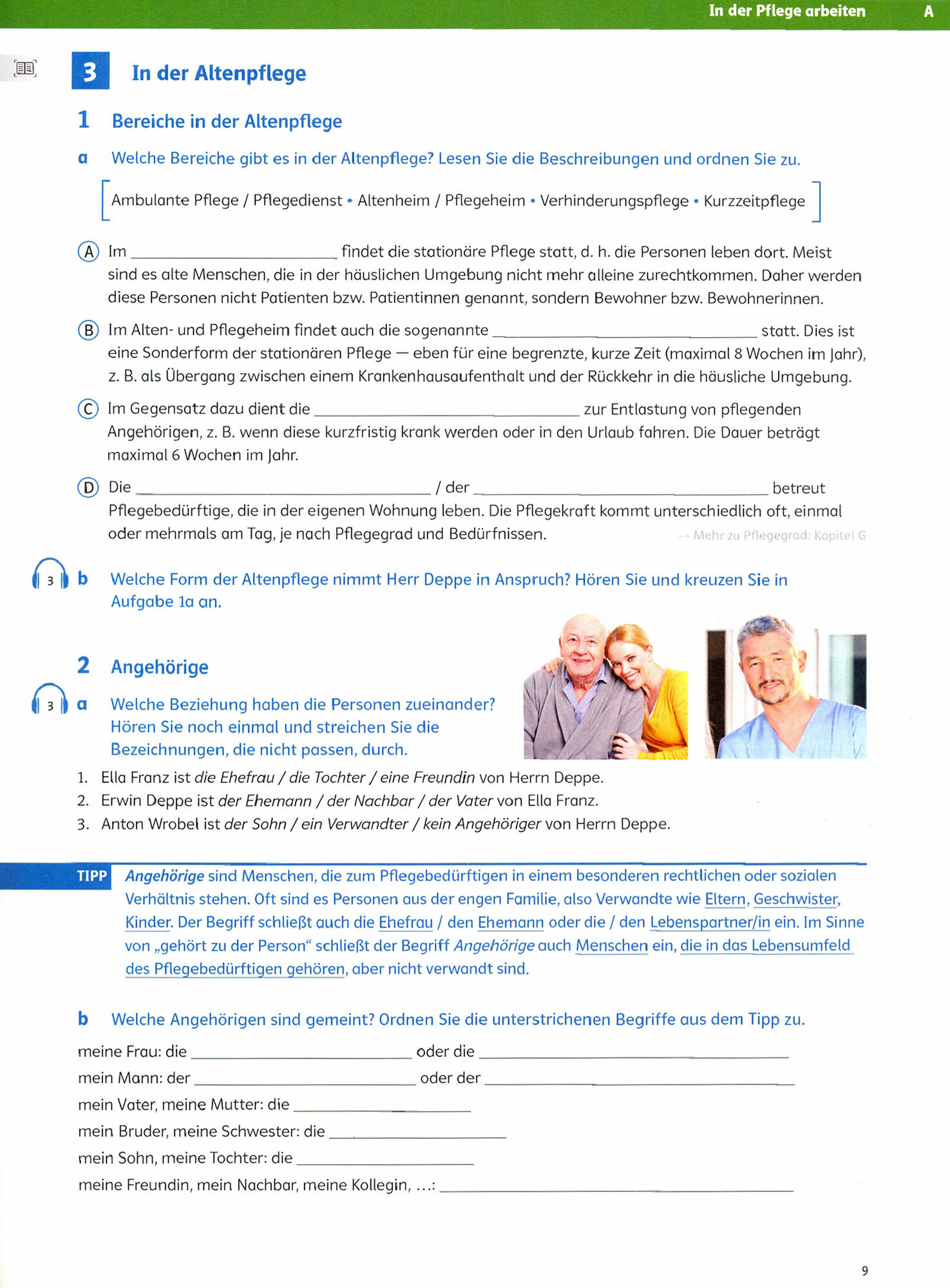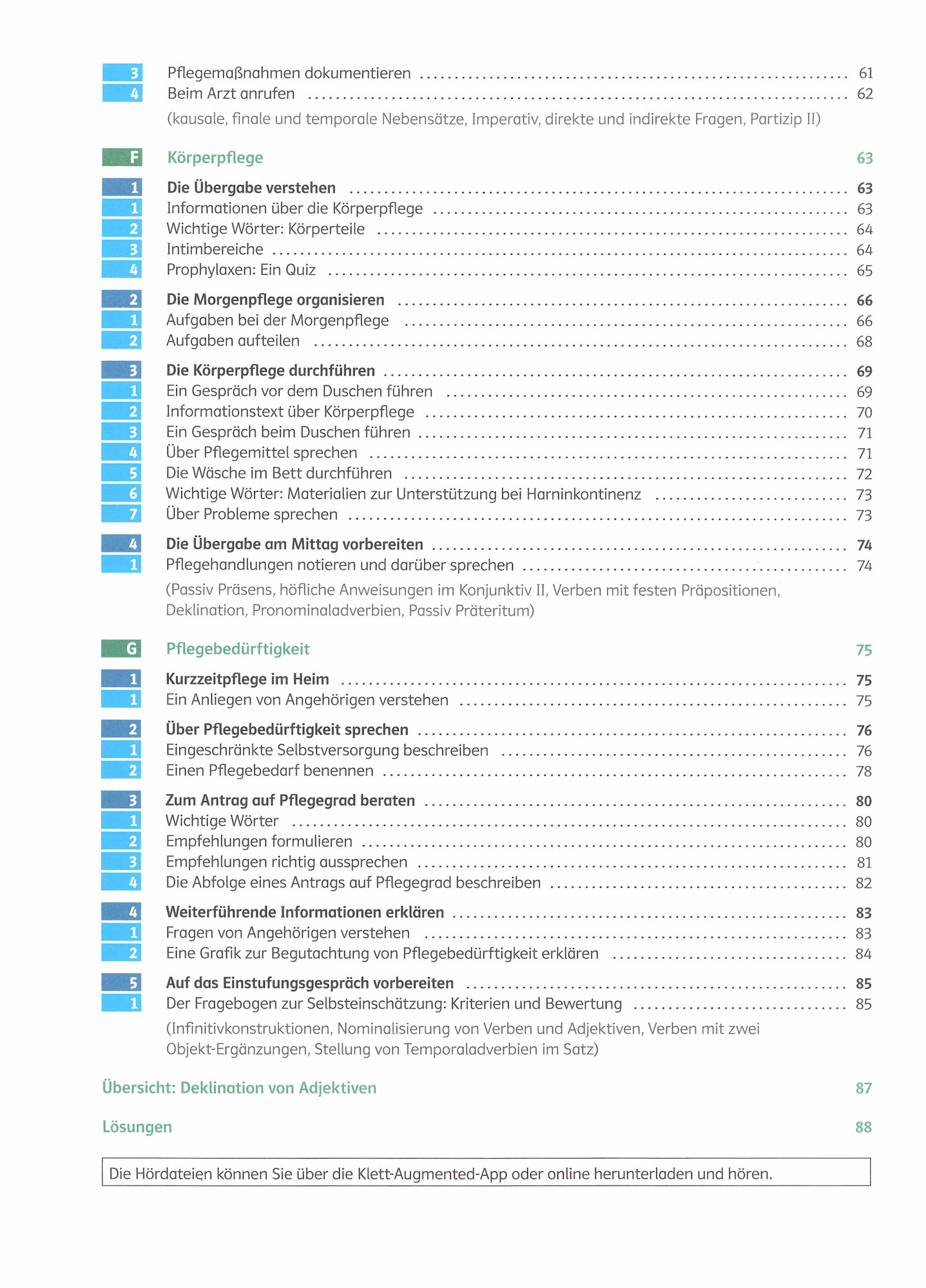 Zum intensiven Training berufssprachlicher Deutschkenntnisse von Pflegefachkraften - fur Selbstlerner oder erganzend zum Einsatz im Deutschkurs Trainiert sprachliches Handeln in ausgewahlten Pflegesituationen wie Aufnahme, Ubergabe, Pflege von Patienten mit unterschiedlichen Krankheitsbildern, Hygiene im Pflegeheim, Korperpflege und Pflegebedurftigkeit Fur eine realistische Kommunikation mit Kollegen, Patienten und Angehorigen Greift dafur relevante Sprachstrukturen und Wortschatz auf Wiederholt und ubt auf den Niveaustufen B1 und B2 Mit hilfreichen Tipps zu Grammatik und Aussprache Flexibel einsetzbar Mit Losungen zur Selbstkontrolle Audios uber Klett Augmented und online, Transkriptionen online als DownloadZum intensiven Training berufssprachlicher Deutschkenntnisse von Pflegefachkraften - fur Selbstlerner oder erganzend zum Einsatz im Deutschkurs Trainiert sprachliches Handeln in ausgewahlten Pflegesituationen wie Aufnahme, Ubergabe, Pflege von Patienten mit unterschiedlichen Krankheitsbildern, Hygiene im Pflegeheim, Korperpflege und Pflegebedurftigkeit Fur eine realistische Kommunikation mit Kollegen, Patienten und Angehorigen Greift dafur relevante Sprachstrukturen und Wortschatz auf Wiederholt und ubt auf den Niveaustufen B1 und B2 Mit hilfreichen Tipps zu Grammatik und Aussprache Flexibel einsetzbar Mit Losungen zur Selbstkontrolle Audios uber Klett Augmented und online, Transkriptionen online als Download.