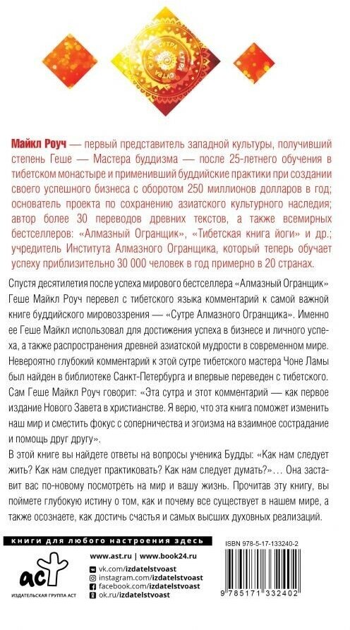 Спустя десятилетия после успеха мирового бестселлера "Алмазный Огранщик" Геше Майкл Роуч перевел с тибетского языка комментарий к самой важной книге буддийского мировоззрения - "Сутре Алмазного Огранщика". Именно ее Геше Майкл использовал для достижения успеха в бизнесе и личного успеха, а также распространения древней азиатской мудрости в современном мире. Невероятно глубокий комментарий к этой сутре тибетского мастера Чоне Ламы был найден в библиотеке Санкт-Петербурга и впервые переведен с тибетского.