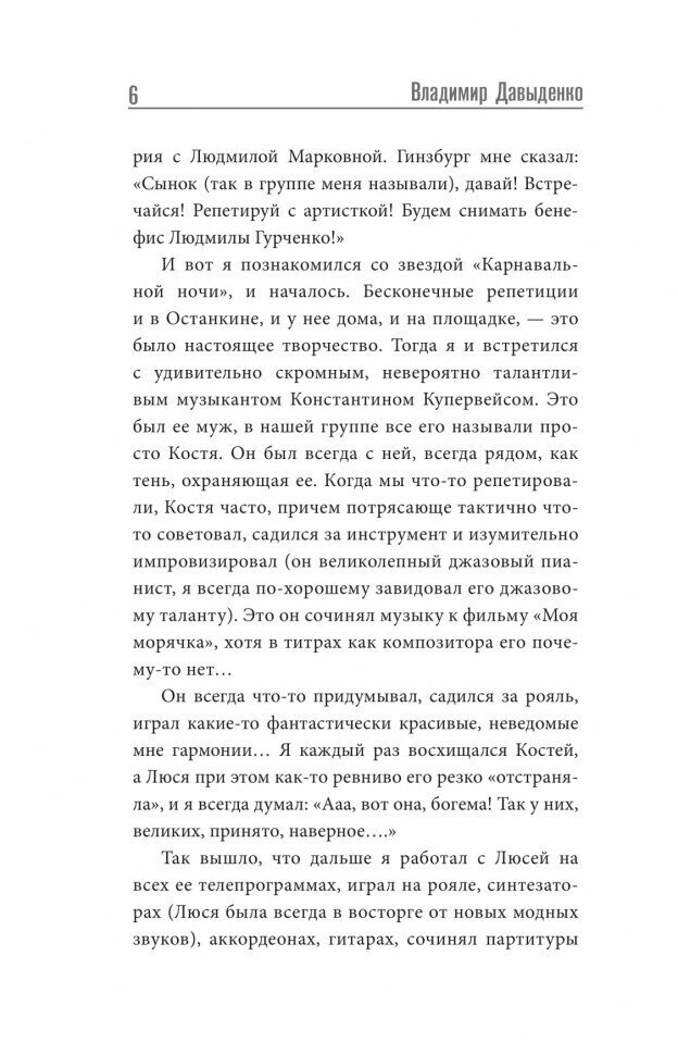 «Двадцать дней без войны», «Мама», «Сибириада», «Любимая женщина механика Гаврилова», «Вокзал для двоих», «Любовь и голуби» - фильмы, покорившие сердца зрителей и ставшие классикой советского кинематографа. А имя Людмилы Гурченко, исполнившей в них главную роль, стало известно каждому. Настоящая книга написана ее мужем, известным музыкантом Константином Купервейсом, с которым она прожила почти двадцать лет. Это были годы очень яркой, насыщенной творческой жизни актрисы. В это время она работала с такими режиссерами, как Эльдар Рязанов, Владимир Меньшов, Петр Тодоровский, Алексей Герман, Андрон Кончаловский, а ее партнерами были Юрий Никулин, Сергей Юрский, Олег Басилашвили, Сергей Шакуров и многие другие. Автор рассказывает о жизни великой актрисы, ее взлетах и падениях, личных победах и личном счастье. И во всем опорой ей был он, любящий муж, который находился постоянно рядом, поддерживая, вдохновляя, придавая сил, помогая вынести все испытания судьбы. В формате PDF A4 cсохранен издательский дизайн.