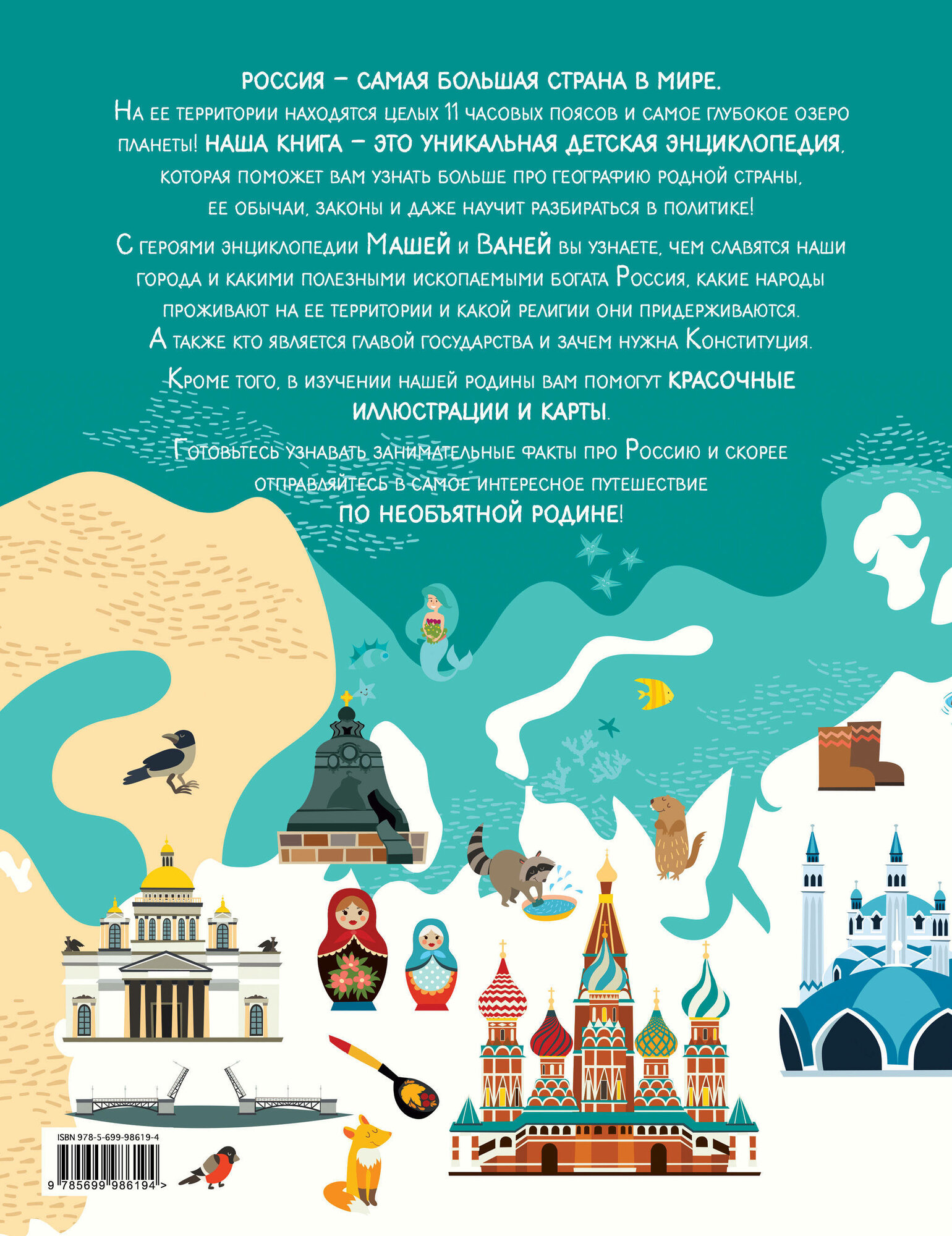 С героями книги Машей и Ваней дети узнают, чем славятся наши города и какими полезными ископаемыми богата Россия, какие народы проживают на ее территории и какую религию они исповедают, а также кто является главой государства и зачем нужна Конституция. Энциклопедия написана доступным для ребенка языком и сообщает множество увлекательных и важных фактов, которые помогут ребенку больше узнать о родине!