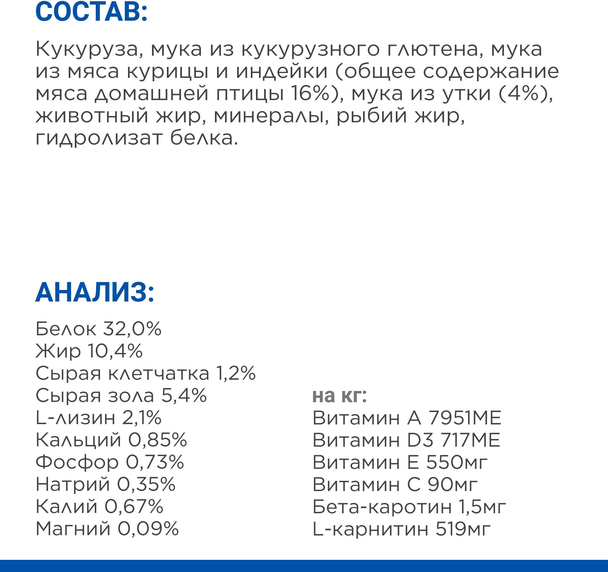 - Низкое содержание жира и высокий уровень L-лизина для поддержания энергичности.
