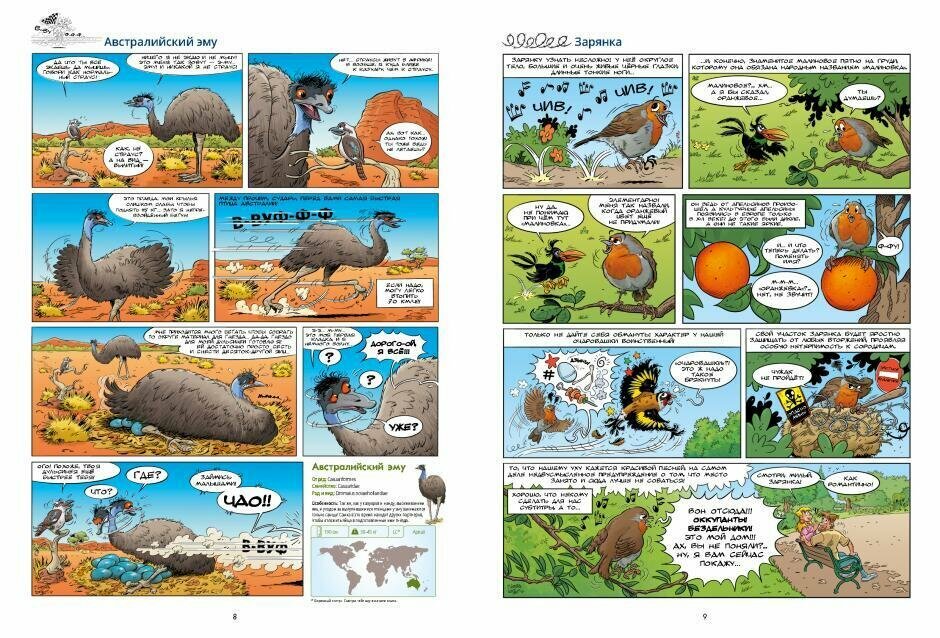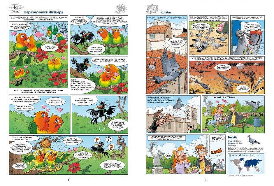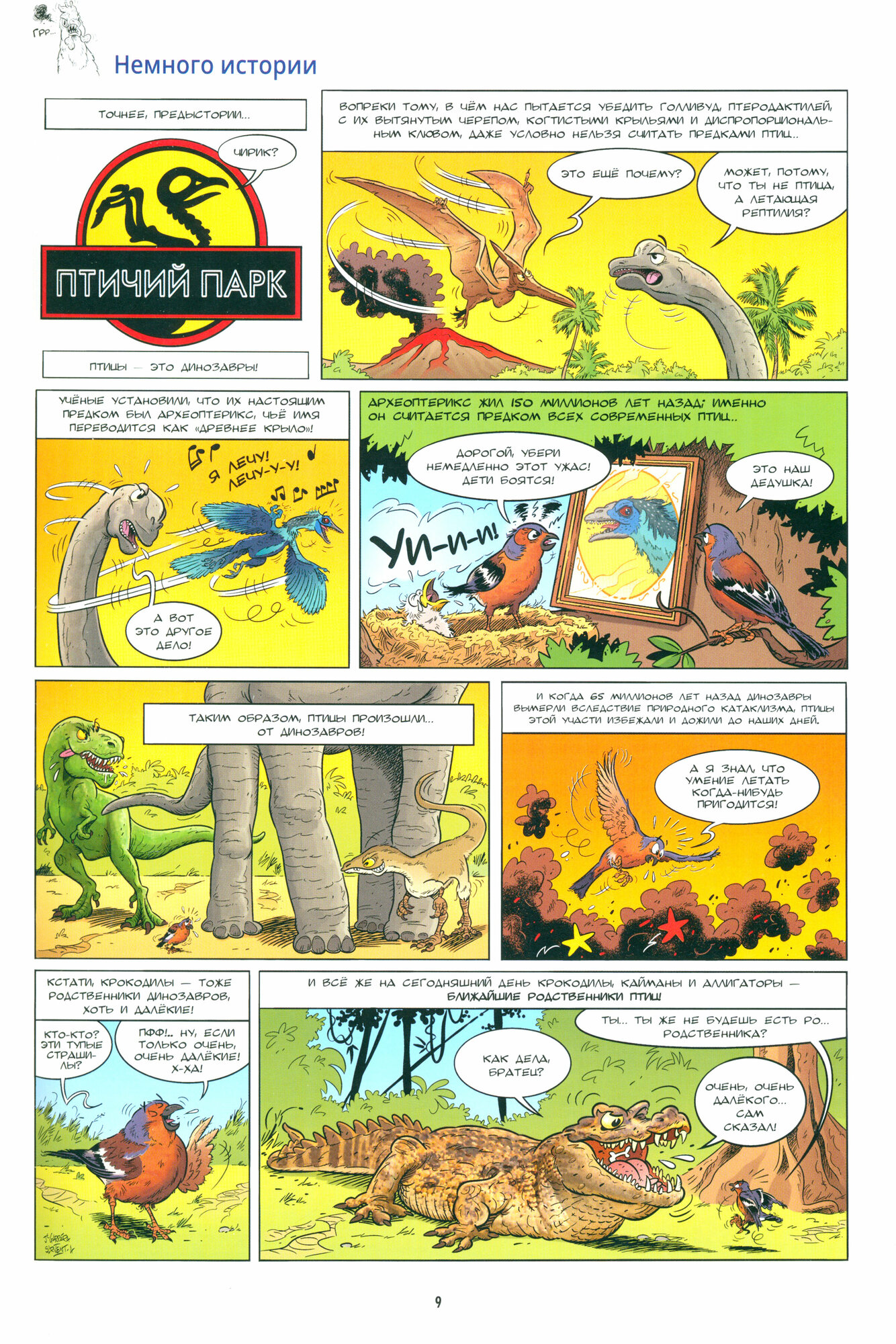 На сей раз французские комиксисты, уже порадовавшие российских читателей яркими сериями про насекомых, морских животных и динозавров, взялись за птиц. А это значит, что вас ждёт встреча с новыми рисованными героями - и не только хорошо всем известными голубями, сороками и воробьями! На страницах первого тома вы познакомитесь с персонажами куда более экзотическими: траурным дронго, скальным петушком, двурогим калао, дымчатым лягушкоротом и многими, многими другими. Вы также узнаете, чем челноклюв отличается от цапли, какую птицу считают самой опасной в мире, во что белоголовому орлану обходится его жадность, едят ли пеликаны других птиц и даже... от чего умер древнегреческий драматург Эсхил! Дополнительную интригу серии придаёт и тот факт, что над ней работает новая, еще не знакомая нашему читателю команда авторов: сценарист Жан-Люк Гаррера, художник Ален Сирван и колорист Давид Ленван, которые решили слегка сместить акцент в научную сторону. Иными словами, эту книгу вполне можно рассматривать как красочную мини-энциклопедию, а обширный познавательный материал, следующий после комикса, подобное впечатление лишь усиливает. Впрочем, фирменный юмор коллекции никуда не делся, и те, кто успел полюбить предыдущие серии за возможность немного повеселиться, разочарованными не останутся. Ну а в том, что птицы - милейшие существа, никто и не сомневался!