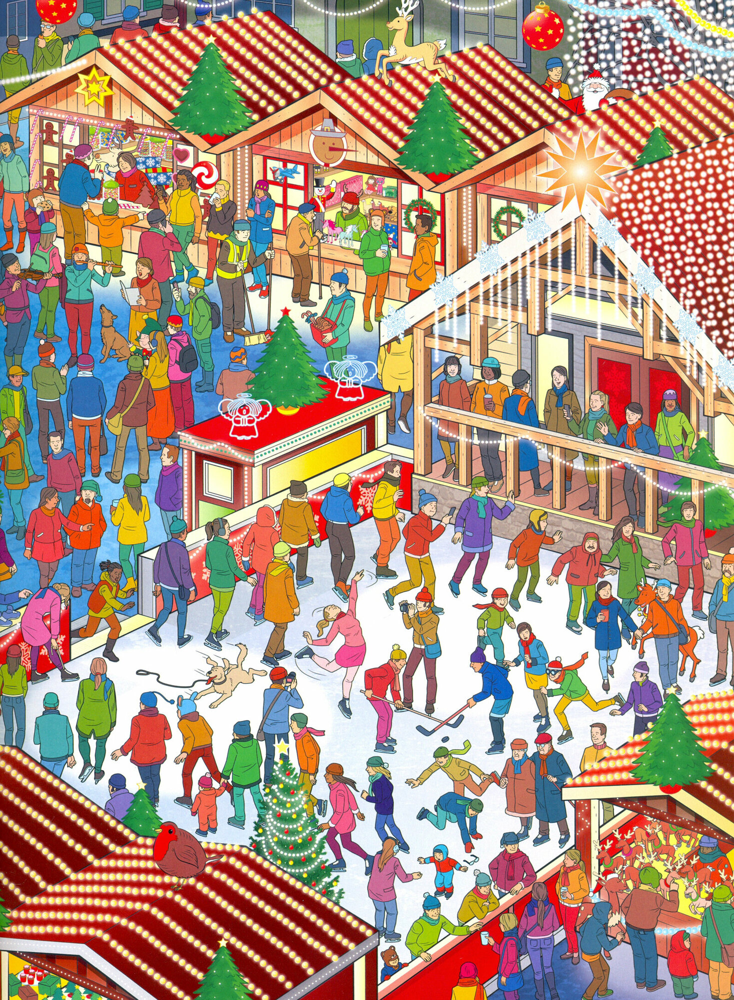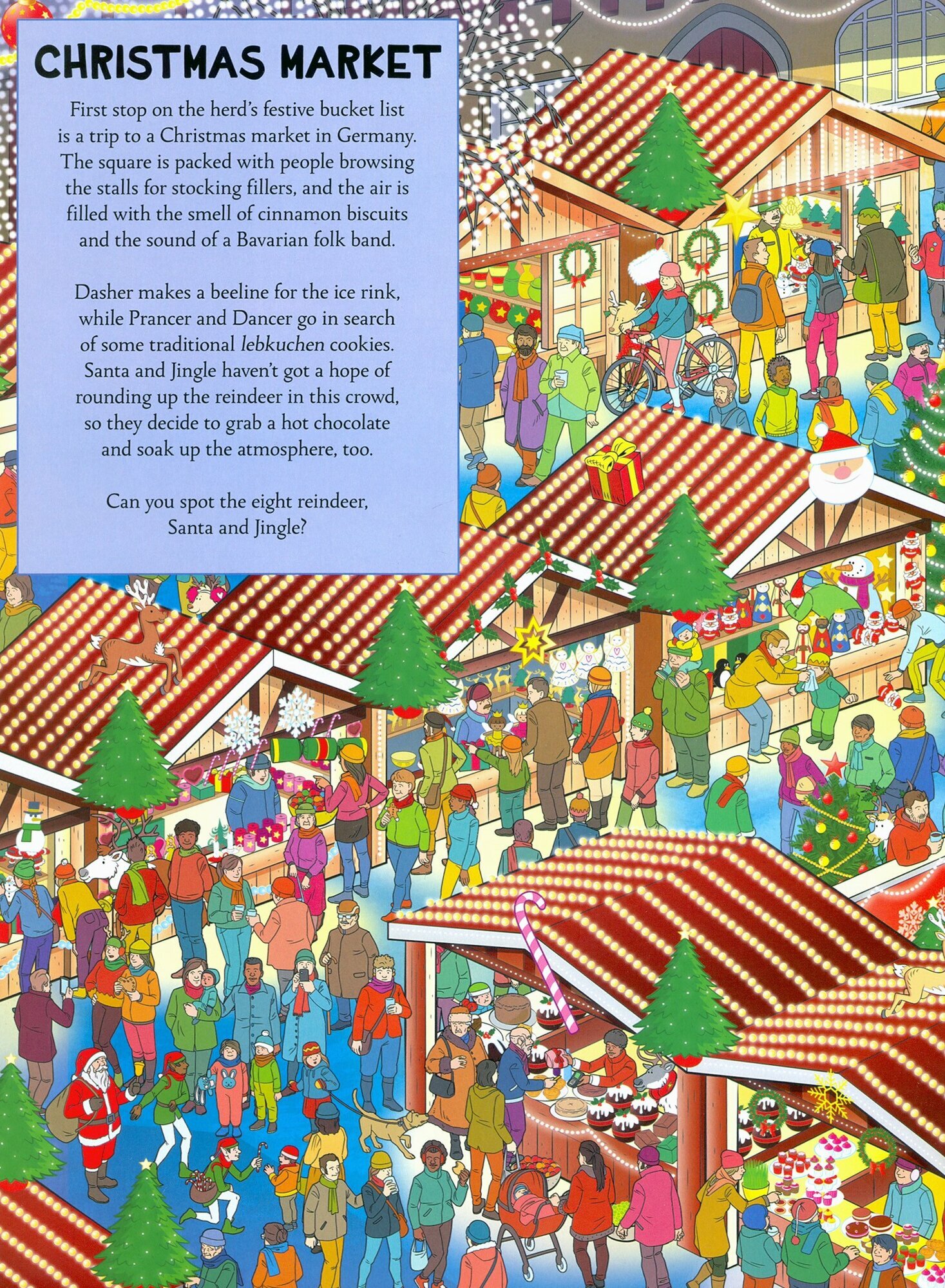 There's a week to go before Christmas Eve and Santa's eight favorite reindeer are nowhere in sight! Santa can't deliver all the presents in one night without his trusted herd to pull the sleigh, so he and his chief elf set off to find them. Help Santa chase the reindeer through 17 intricately illustrated seasonal scenes and bring them home to the North Pole in time to load up the sleigh. There are 8 cute reindeer, plus Santa and his elf, to find in each location and the answer pages at the back feature extra things to spot.