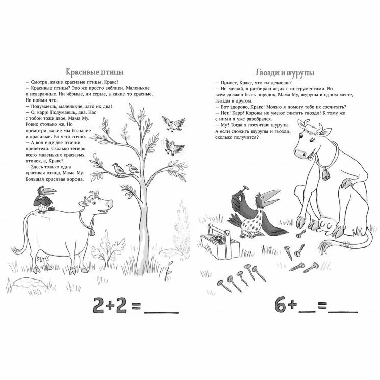 Мама Му и Кракс играют с цифрами. Они считают птиц, раскладывают шурупы и гвозди и придумывают другие весёлые развлечения.