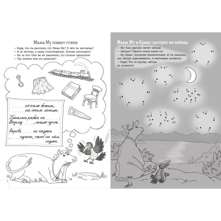 Нечем заняться? Присоединяйся к Маме Му и Краксу! Вместе вы сможете играть в следопытов и тайных агентов, нырять, качаться на качелях, решать кроссворды, искать батарейки и всякую всячину, учить буквы, летать, кататься на велосипеде, строить, отдыхать, изобретать, раскрашивать, светить фонариком, устраивать пикники, мечтать, писать стихи, смотреть на звёзды, изображать разных животных, рыбачить, наводить порядок, собирать цветы и танцевать.