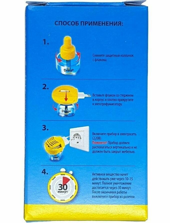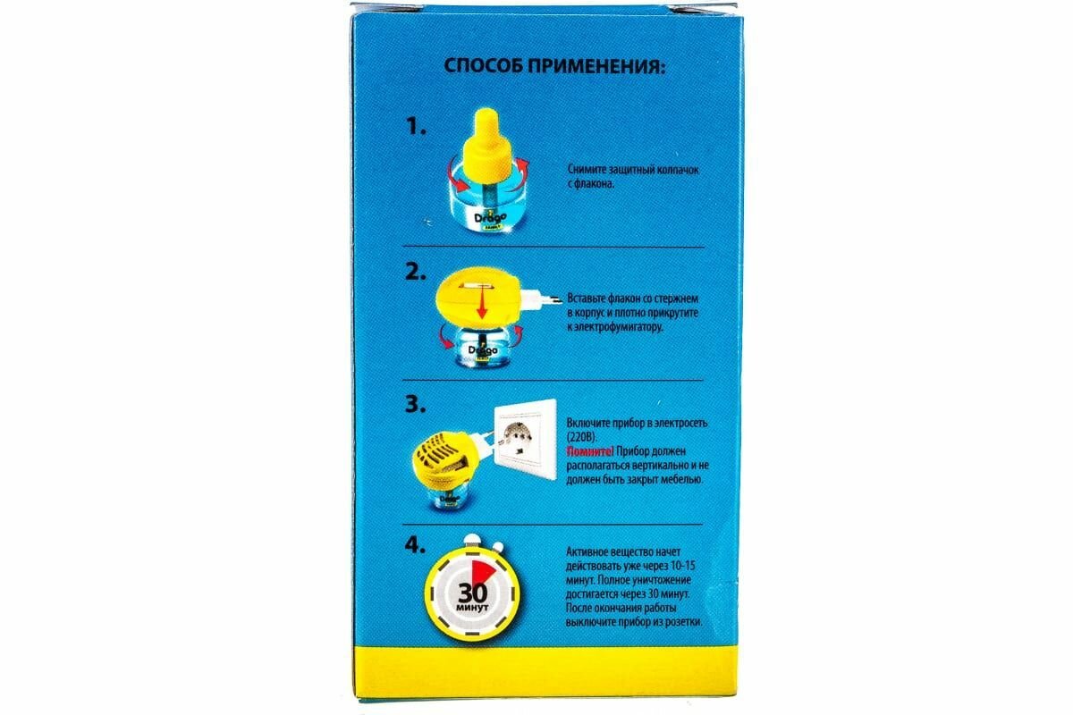 Средство инсектицидное "Жидкость от комаров" предназначено для уничтожения комаров в помещениях. Равномерное нагревание и испарение действующего вещества способствует уничтожению комаров уже через 10-15 минут после включения прибора. Полное уничтожение комаров достигается через 30 минут.