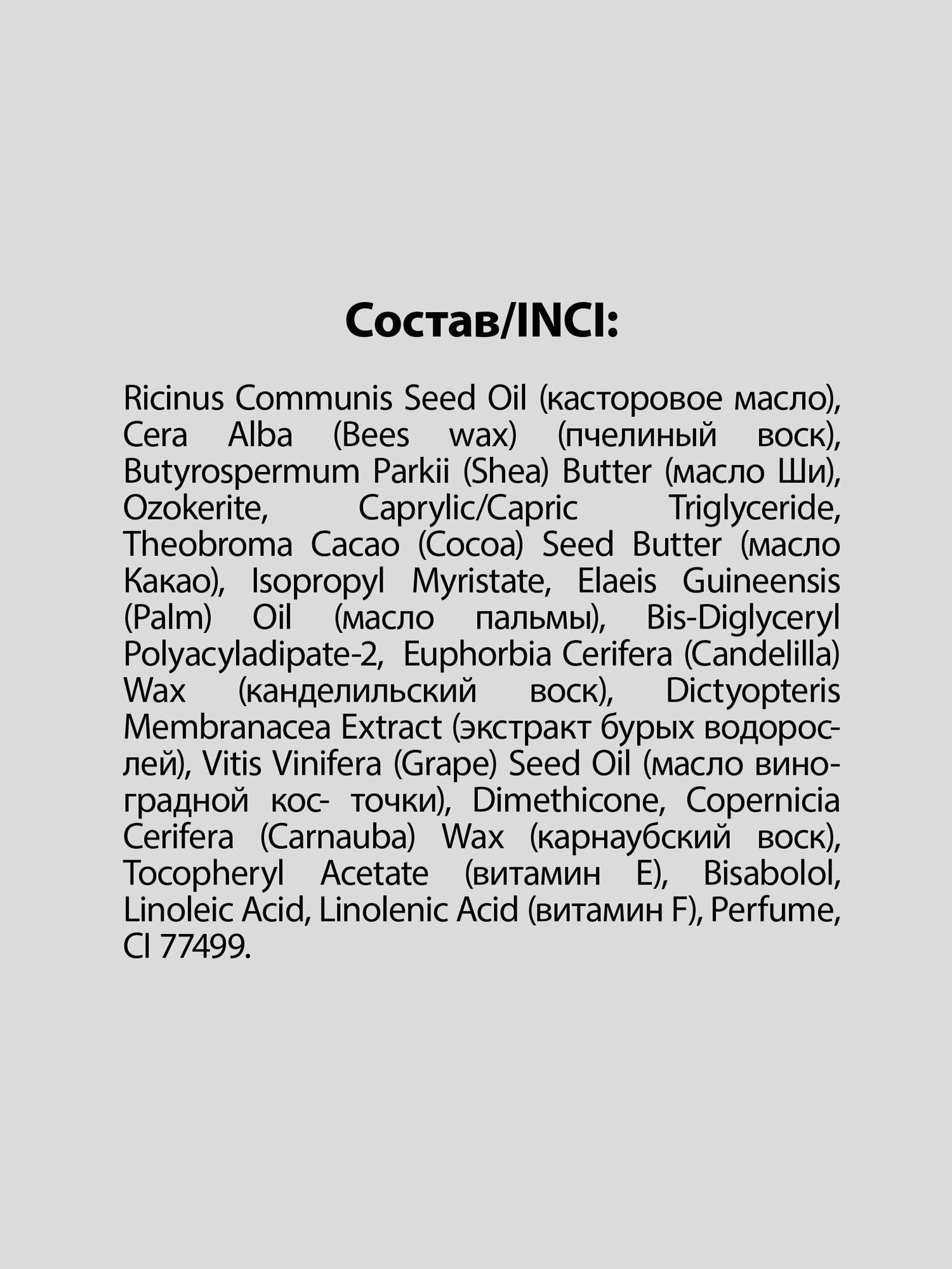 | Состав | ricinus communis (castor) seed oil (касторовое масло); cera alba (bees wax) (пчелиный воск); isopropyl myristate; cocos nucifera (coconut) oil (масло кокоса); ozokerite; caprylic/capric triglyceride; vitis vinifera (grape) seed oil (масло виноградной косточки); theobroma cacao (cocoa) seed butter (масло какао); bis-diglyceryl polyacyladipate-2; elaeis guineensis (palm) oil (масло пальмы); euphorbia cerifera (candelilla) wax (канделильский воск); dimethicone; copernicia cerifera (carnauba) wax (карнаубский воск); tocopheryl acetate (витамин е); bisabolol; linoleic acid; linolenic acid (витамин f); perfume |