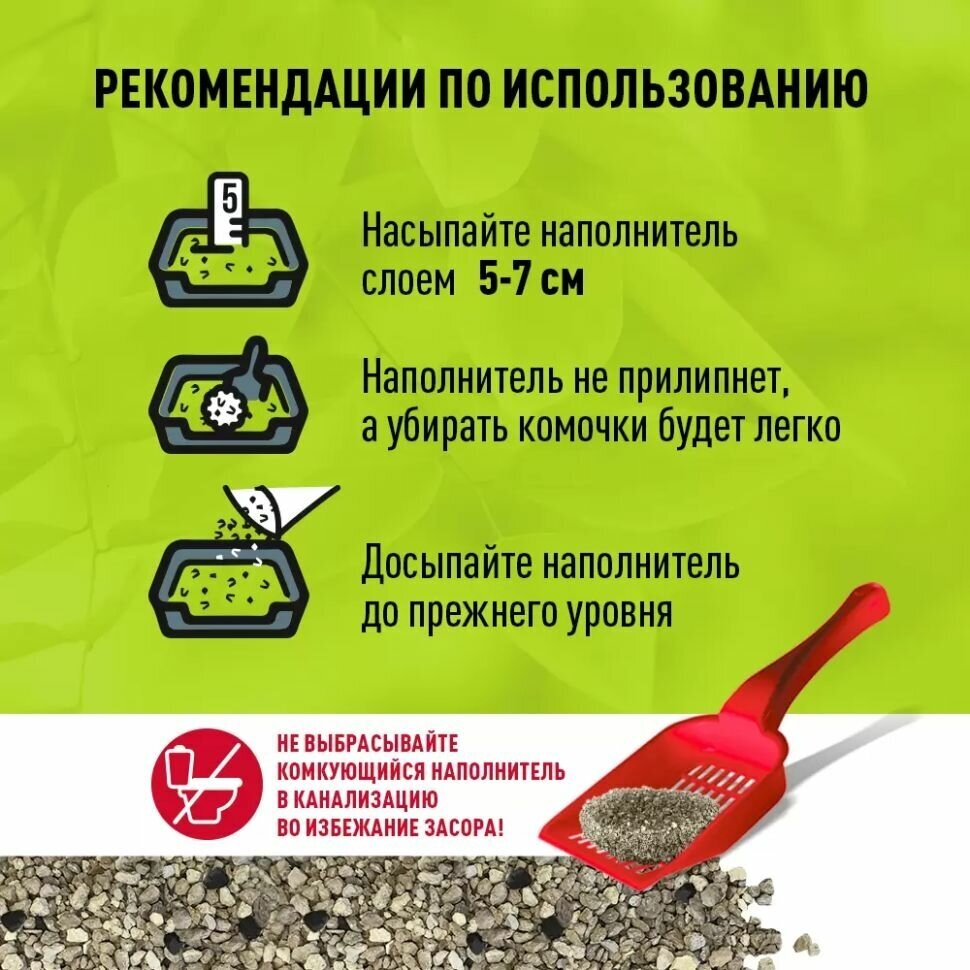 Рекомендации: подберите оптимальный по размеру лоток для Вашего питомца. Рекомендуем лоток с высокими бортиками. Насыпьте в лоток слой наполнителя не менее 5 см. Обязательно следите за поддержанием такого уровня в лотке. Следите за чистотой лотка и регулярно убирайте комочки и твердые отходы специальным совочком в мусорный пакет. Досыпайте наполнитель до прежнего уровня. При меньшем слое наполнитель будет работать неэффективно. Периодически проводите дезинфекцию лотка.