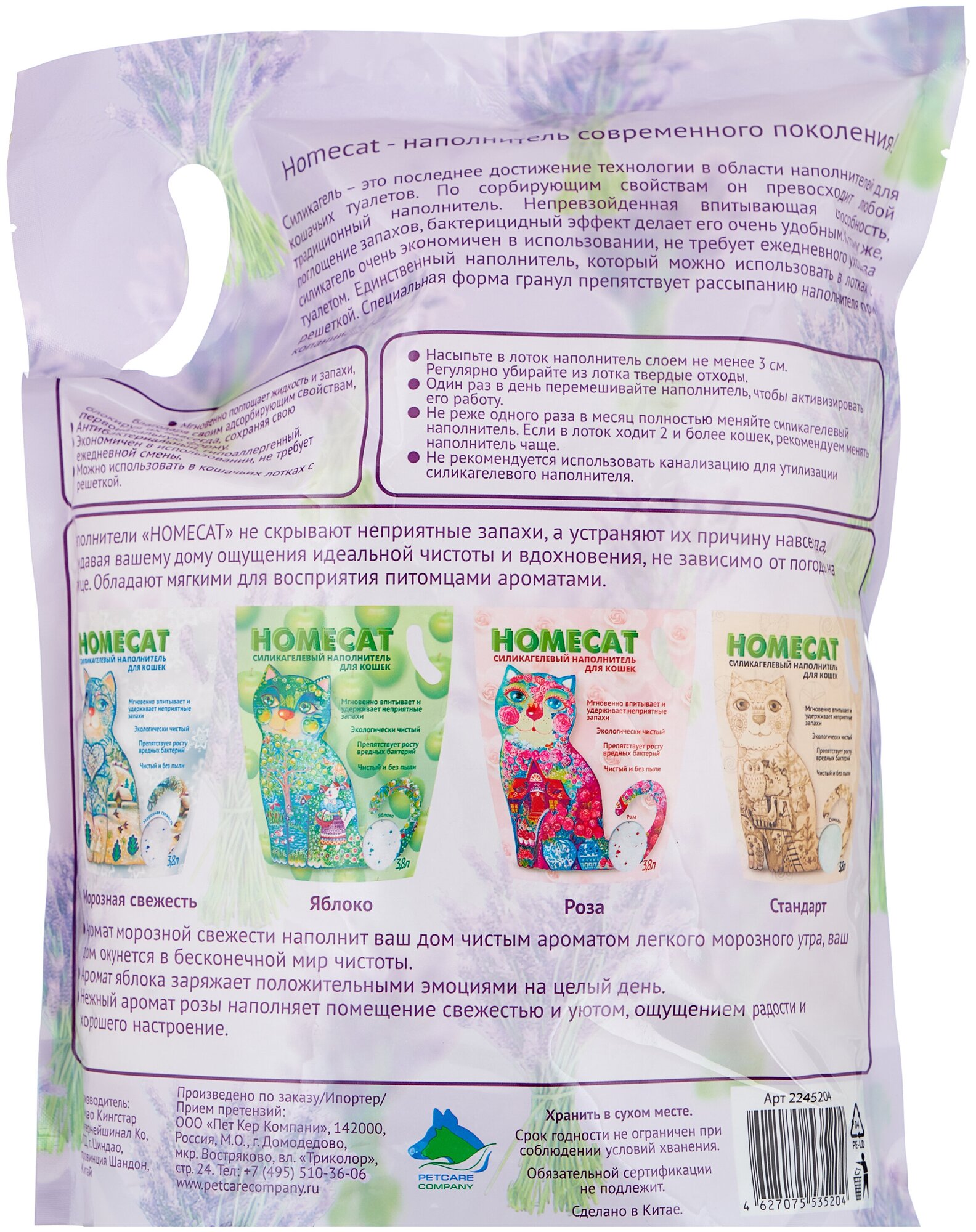 Современный силикагелевый наполнитель HOMECAT для прогрессивных владельцев домашних кошек устраняет причину неприятных запахов навсегда, придавая Вашему дому ощущения чистоты. Обладает мягкими для восприятия питомцами ароматами. Высокие впитывающие свойства силикагеля, поглощение запахов, бактерицидный эффект делает его очень удобным в применении. Экономичен в использовании, не требует ежедневной смены. Специальная форма гранул препятствует рассыпанию при копании. Не пылит. Можно использовать в кошачьих лотках с решеткой. Мгновенно поглощает жидкость и запахи, благодаря своим адсорбирующим свойствам, блокируя их навсегда, сохраняя свою первоначальную форму.
