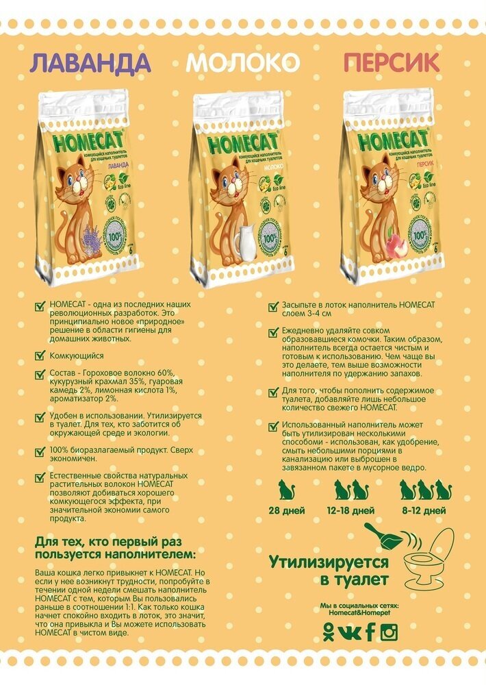 Наполнитель HOMECAT - экологически чистый безопасный 100% биоразлагаемый изготовленный из растительного сырья комкующийся наполнитель для кошачьих туалетов. Основные преимущества С повышенной способностью водопоглощения и блокирования запаха. Безопасен для животного и человека. Поддерживает чистоту кошачьего туалета длительное время, подавляет запах, предотвращает рост бактерий. Обладает повышенным абсорбирующими свойствами, отлично удерживает влагу и запах внутри комка. Легкое удаление комков. Сверхнизкое содержание пыли. Натуральное сырье характеризуется приятной мягкостью и максимальным отсутствием пыли, обеспечивает приятные ощущения для кошачьих лап и органов дыхания. При производстве используется термообработка для уничтожения вредных микроорганизмов. Проходит несколько тестов безопасности. Добавление натуральных ароматизаторов позволяет долго поддерживать приятный аромат наполнителя. Вакуумная упаковка предотвращает появление бактерий и микроорганизмов. Сверхбыстрое образование комка, который легко удаляется из кошачьего туалета. Впитывает во много раз больше собственного объема. Образовавшиеся комочки после уборки можно утилизировать непосредственно в унитаз. Удобная упаковка с удобной ручкой. Яркий и привлекательный дизайн.