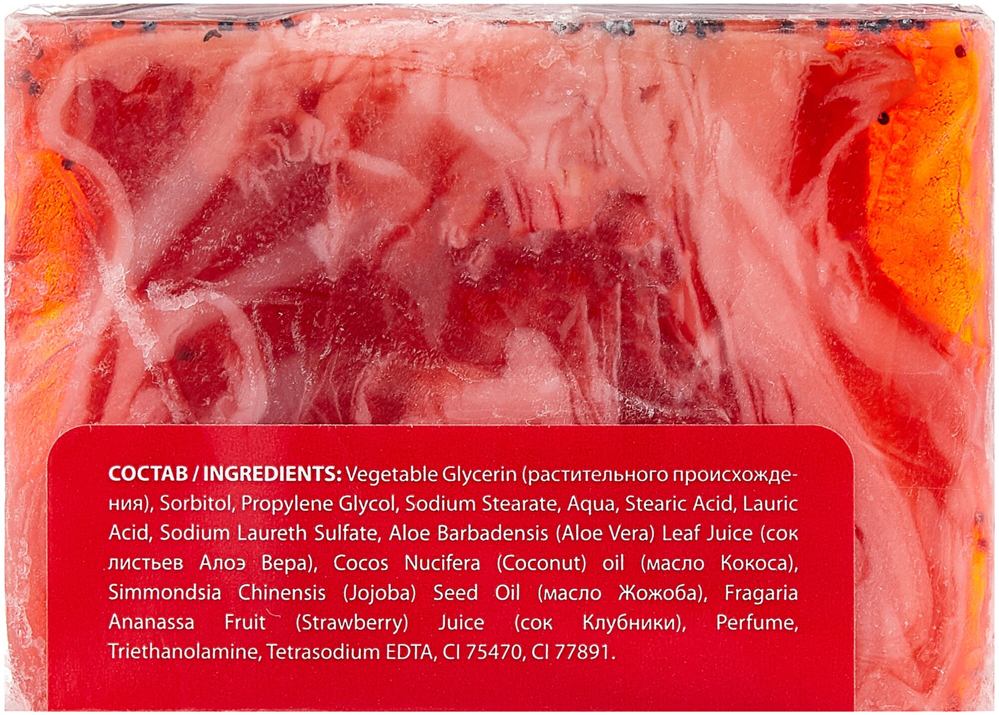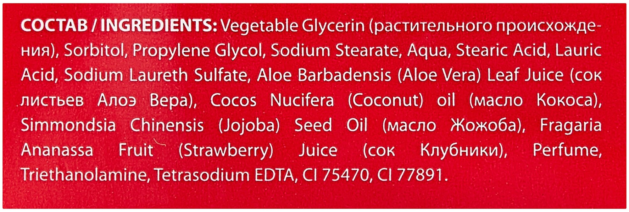 | Состав | Glycerin, Sorbitol, Purified water, Propylene Glycol, Sodium Stearate, Stearic Acid, Lauric Acid, Sodium Laureth Sulfate, Aloe Vera Gel (Гель Алое), Cocos nucifera oil (масло кокоса), Simmonsia chinensis oil (масло Жожоба), Fragaria Moschata juice (сок Клубники), Perfume, Triethanolamine, Tetrasodium EDTA, CI 77891, CI 45410. |