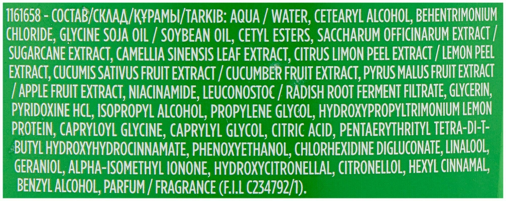 | Состав | aqua, cetearyl alcohol, behentrimonium chloride, slycine soja oil, cetyl esters, saccharum officinarum extract - sugarcane extract, camellia sinensis leaf extract, citrus limon peel extract - lemon peel extract, cucumis sativus fruit extract - cucumber fruit extract, pyris malus fruit extract - apple fruit extract, niacinamide, leucostoc - radish root ferment filtrate, glycerin, pyroxide hcl, isopropyl alcohol, propylene glycol, hydroxypropyltrimonium lemon protein, capryloyl glycine, caprylyl glycol, citric acid, pentaerythrityl tetra-di-t-butyl hydroxyhydrocinnamate, phenoxyethanol, chlorhexidine digluconat, linalool, geraniol. alpha-isomethyl ionone, hydroxycitronellal, citronellol, hexyl cinnamal, benzyl alcohol, parfum - fragrance (f.i.l. c234792-1). |