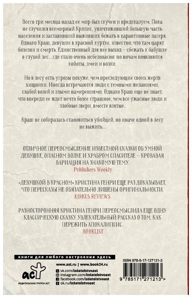 Всего три месяца назад ее мир был скучен и предсказуем. Пока не случился всемирный Кризис, уничтоживший большую часть населения и заставивший выживших бежать в карантинные лагеря. Однако, Краш, девушке в красной куртке, известно, что там процветают болезни и смерть. Единственный для нее выход - сбежать к бабушке в глухой лес… где стало очень небезопасно: по ночам появляются койоты, змеи и волки.