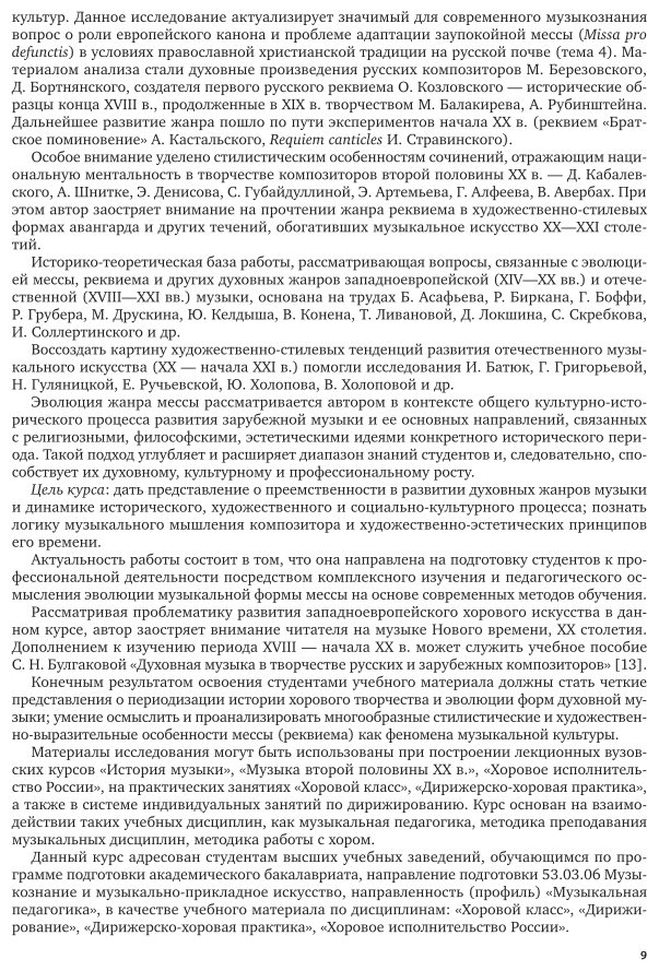 Курс направлен на развитие профессиональных знаний студентов, расширение педагогического и концертного репертуара хорового класса. Представлена эволюция хорового творчества от эпохи раннего Средневековья до музыки XXI в. Через призму становления и развития формы реквиема рассмотрены важнейшие вехи в истории западноевропейской музыкальной культуры. Краткий исторический анализ сочинений современных композиторов, предложенный в нотной части, может служить в качестве учебного материала по музыкально-теоретическим дисциплинам, истории хорового искусства и для работы в хоровом классе, на занятиях по дирижированию. Соответствует актуальным требованиям Федерального государственного образовательного стандарта высшего образования. Для студентов вузов, музыкальных колледжей и средних профессиональных учебных заведений.