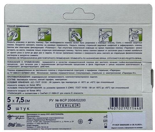 Каждая повязка Парапран с Химотрипсином для сохранения 100% стерильности реализуется в индивидуальной упаковке.