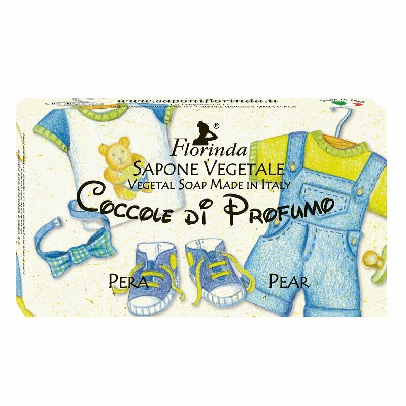 Мыло Аромат Детства Груша Florinda Cocole Di Profumo Pera образует пышную пену, наполненную натуральными растительными эссенциями, активно увлажняющими кожу и делающими ее шелковистой. В состав мыла входят только натуральные растительные масла. Оно не содержит пальмового масла, парабенов, парафинов, сульфатов и искусственных красителей и подходит для чувствительной кожи. При производстве используется только итальянское сырьё, что гарантирует высокое качество продукции, благодаря лучшей сохранности оригинальных активных ингредиентов. Все этапы производства осуществляются в Италии, таким образом, продукция сохраняет и продолжает старинные итальянские традиции и секреты мастерства. Каждый брусок мыла Florinda Cocole Di Profumo Pera изготавливается и нарезается вручную, затем ему придаётся окончательная форма и мыло помещается в яркую стильную упаковку из экологичного материала.