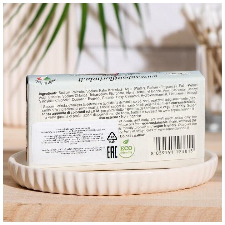 Мыло Florinda - гордость итальянского мыловарения, дошедшего до нас в классических рецептах и традиционных ароматических купажах. Мыло полностью изготовлено из безопасных и натуральных ингредиентов растительного происхождения, что обеспечивает его мягкость и нежную заботу о коже при использовании. Благодаря высокому содержанию в составе парфюмерной композиции, мыло обладает деликатным, ненавязчивым ароматом амбры, в котором каждый почувствует что-то особенное, но неизменно прекрасное. Florinda это не просто великолепный аромат и забота о вашем здоровье - это "запах эмоций".