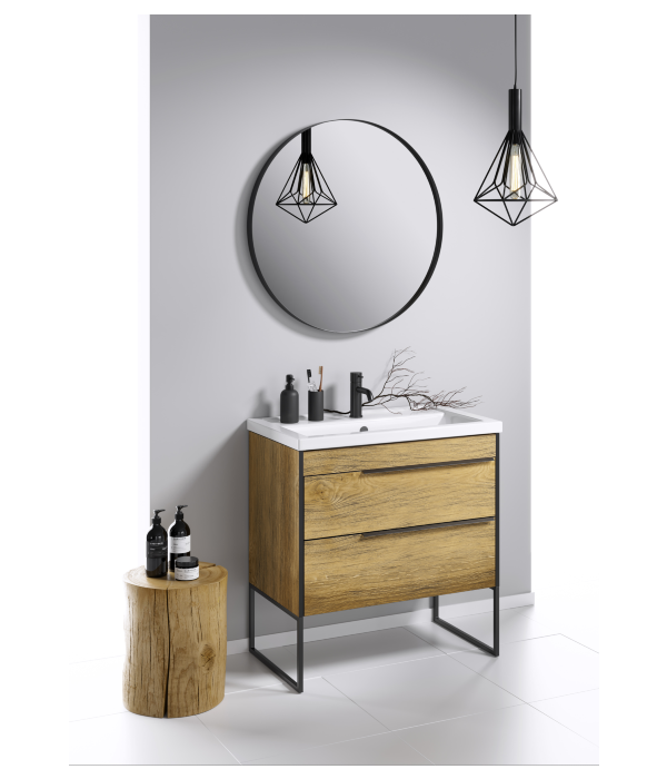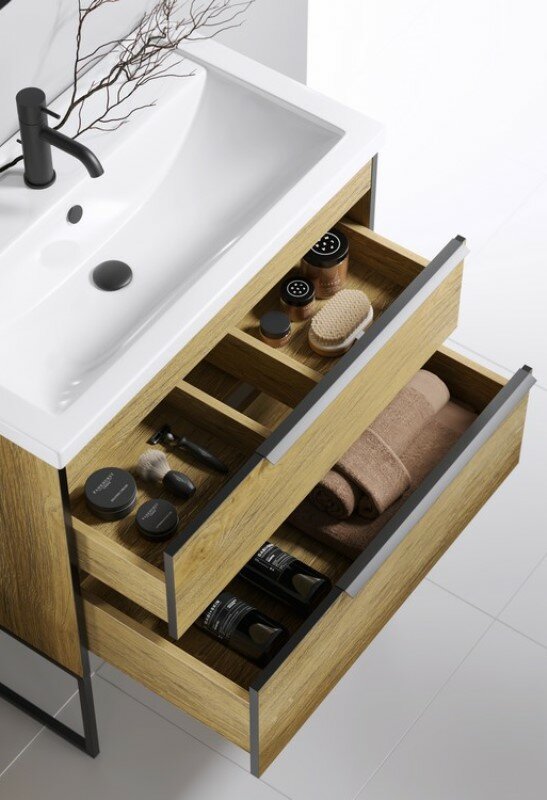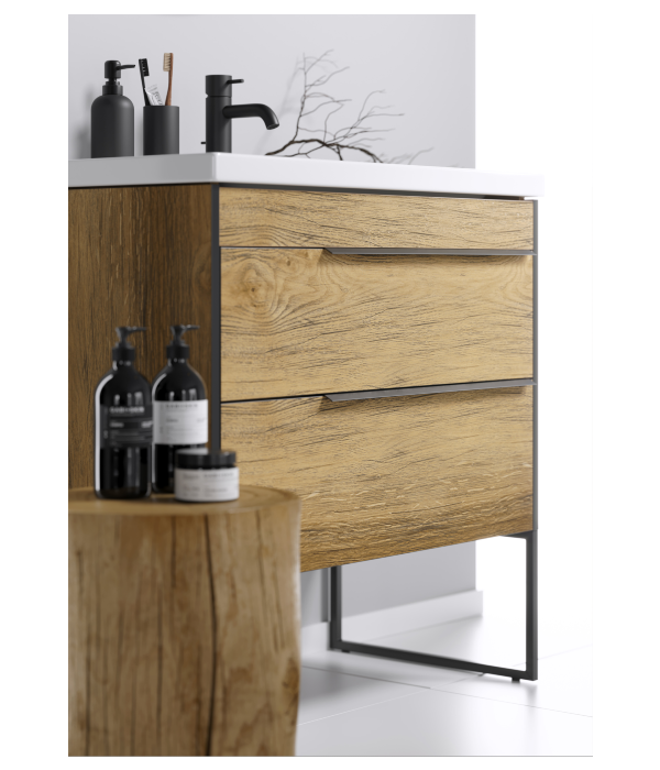 Фасады и корпус выполнены из ЛДСП (древесностружечной плиты повышенной плотности) в цвете дуб балтийский, кромка матового черного цвета. Тумбы поставляются в подвесном исполнении с двумя ящиками, однако при монтаже гарнитур можно сделать напольным. Для этого необходимо добавить в набор ножки необходимого размера. Ножки металлические и окрашены в черный цвет. Алюминиевые ручки на тумбах также окрашены в черный цвет. Разместить ручки можно справа, слева или по центру фасада. Ящики тумб оснащены скрытыми направляющими австрийской фирмы Blum с системой мягкого закрывания (на которые производитель дает вечную гарантию). Внутренняя отделка ящиков – ЛДСП в цвете дуб балтийский. Тумбы данной коллекции оснащены итальянскими навесами Camar, которые выдерживают нагрузку до 200 кг.