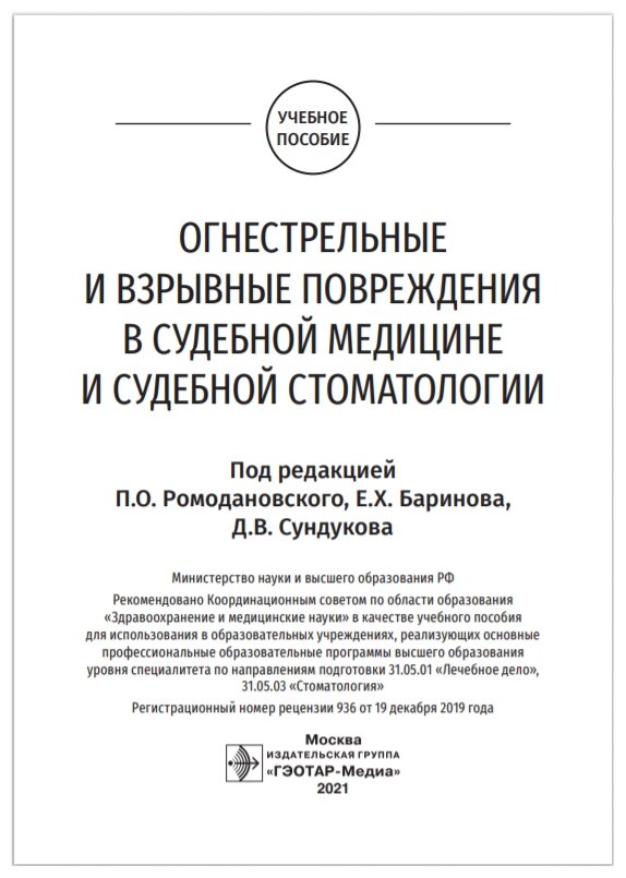 Огнестрельные и взрывные повреждения в судебной медицине и судебной стоматологии. Учебное пособие (Сундуков Дмитрий Вадимович, Баринов Евгений Христофорович, Ромодановский Павел Олегович); ГЭОТАР-Медиа, ГЭОТАР-Медиа, 2020