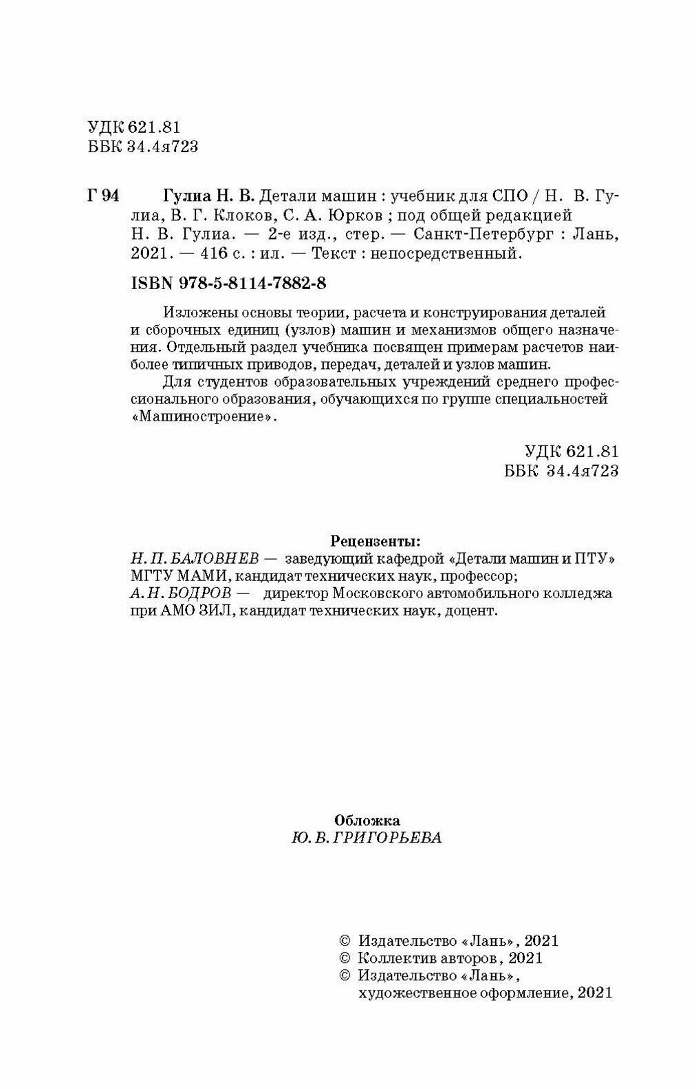 Книга: Детали машин.Уч.СПО (Гулиа Нурбей Владимирович, Юрков Сергей Александрович, Клоков Виктор Георгиевич); Лань, 2021