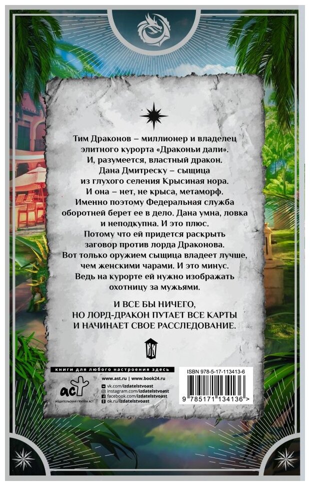 Тим Драконов – миллионер и владелец элитного курорта «Драконьи дали». И, разумеется, властный дракон. Дана Дмитреску – сыщица из глухого селения Крысиная нора. И она – нет, не крыса, метаморф. Именно поэтому Федеральная служба оборотней берет ее в дело. Дана умна, ловка и неподкупна. И это плюс. Потому что ей придется раскрыть заговор против лорда Драконова. Вот только оружием сыщица владеет лучше, чем женскими чарами. И это минус. Ведь на курорте ей нужно изображать охотницу за мужьями.