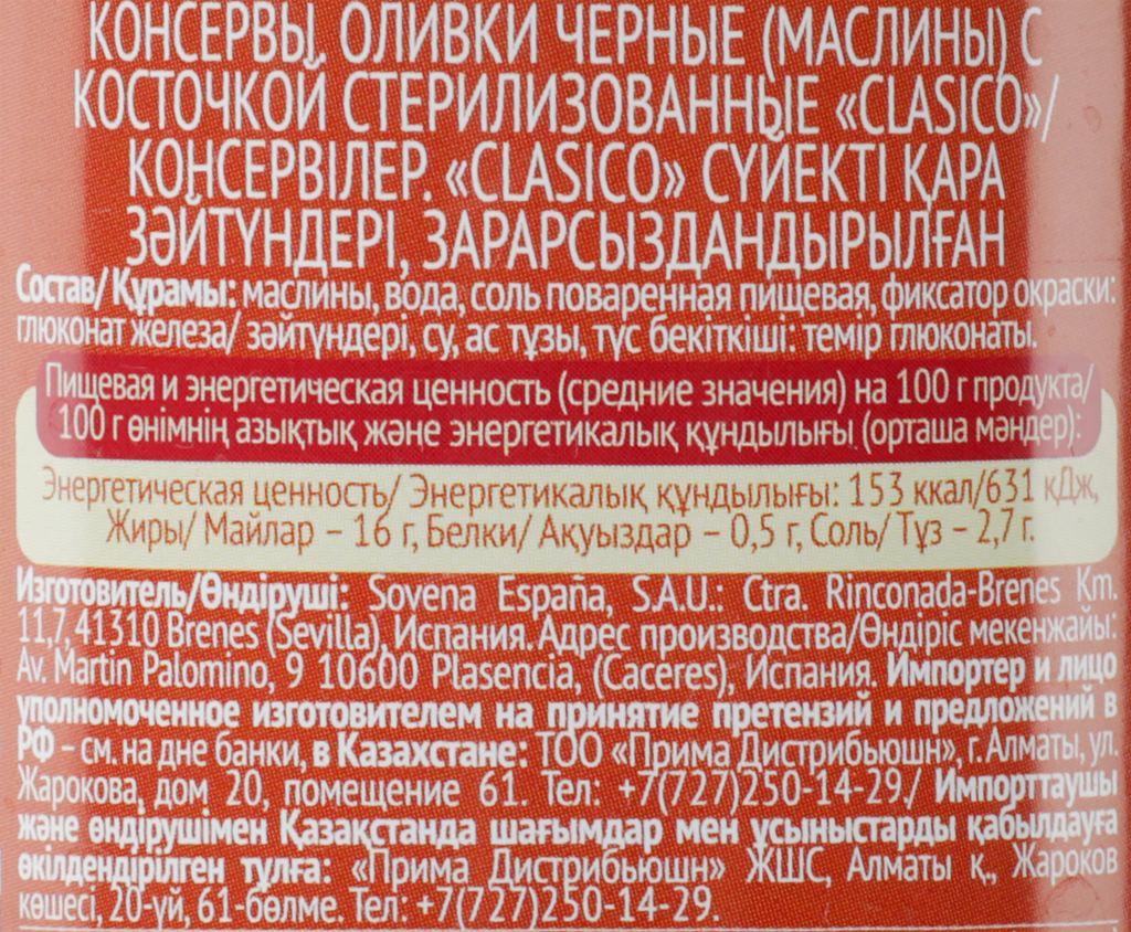 | Состав | Вода, оливки черные (Охибланка), соль поваренная пищевая, фиксатор окраски глюконат железа |