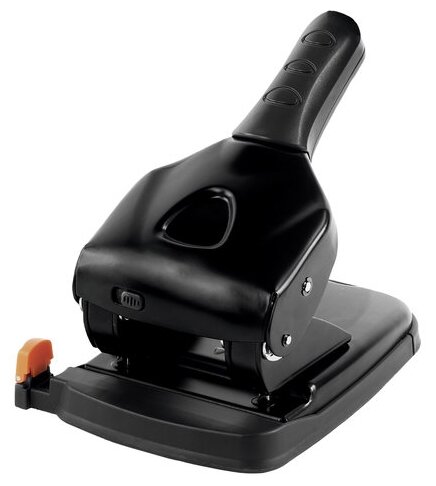 Метка центрирования поможет ровно разместить листы. Наличие ограничительной линейки позволяет пробить отверстия в нужном месте, что делает возможным сложить документы в папку ровной стопкой. Дырокол оснащен блокиратором для компактного хранения.