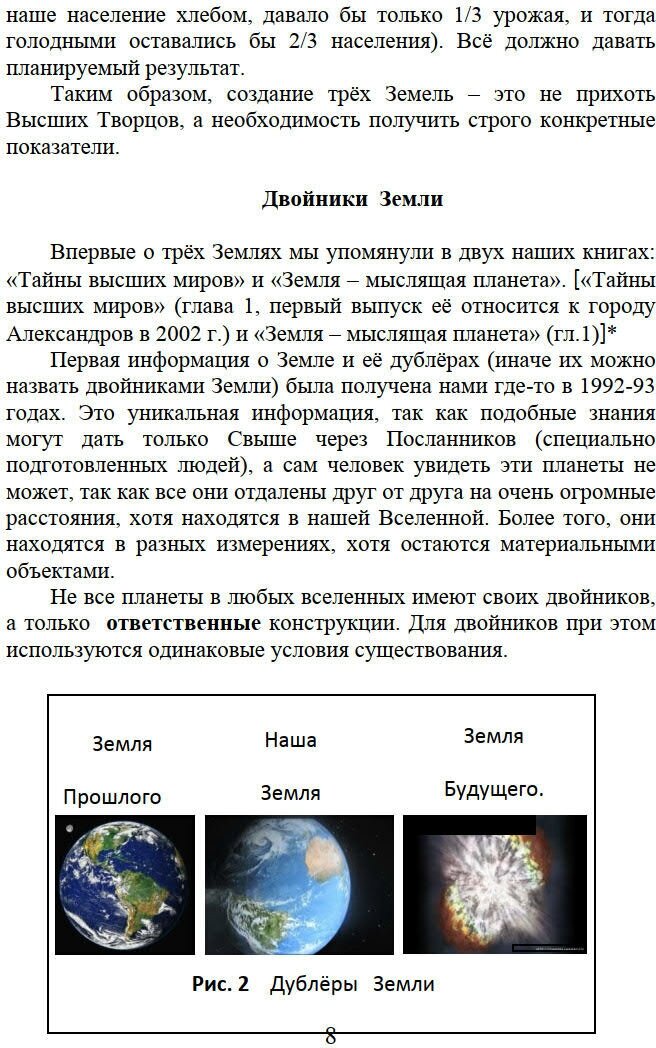 Данная книга раскрывает впервые человечеству Тайну трех Земель, две из которых являются дублерами нашей планеты. Также книга рассказывает, в чем заключается Великий Проект Бога и для каких целей он предназначен, как строился. Читатель узнает о процентном распределении душ в конце 5-й расы и сможет проанализировать, в какую группу попадет сам. Книга обнаруживает новые тайны в иллюстрациях Нострадамуса, приводит ряд интересных предсказаний разных провидцев о нашей стране и будущем человечества. Рассказывает тайны книги "Роза Мира" и ее удивительную нумерологическую связь с жизнью авторов. На страницах книги приводится ряд фактов, открытых исследователями и подтверждающих знания, данные авторам ранее. Много интересного читатель узнает также о том, что происходит на Солнце, Луне, станции Вулкан, о выведении новых форм жизни в тысячеградусном пекле; познакомится с отрицательными Системами, работающими с Землей, впервые узнает, чем Ад на Земле отличается от Ада на Солнце.