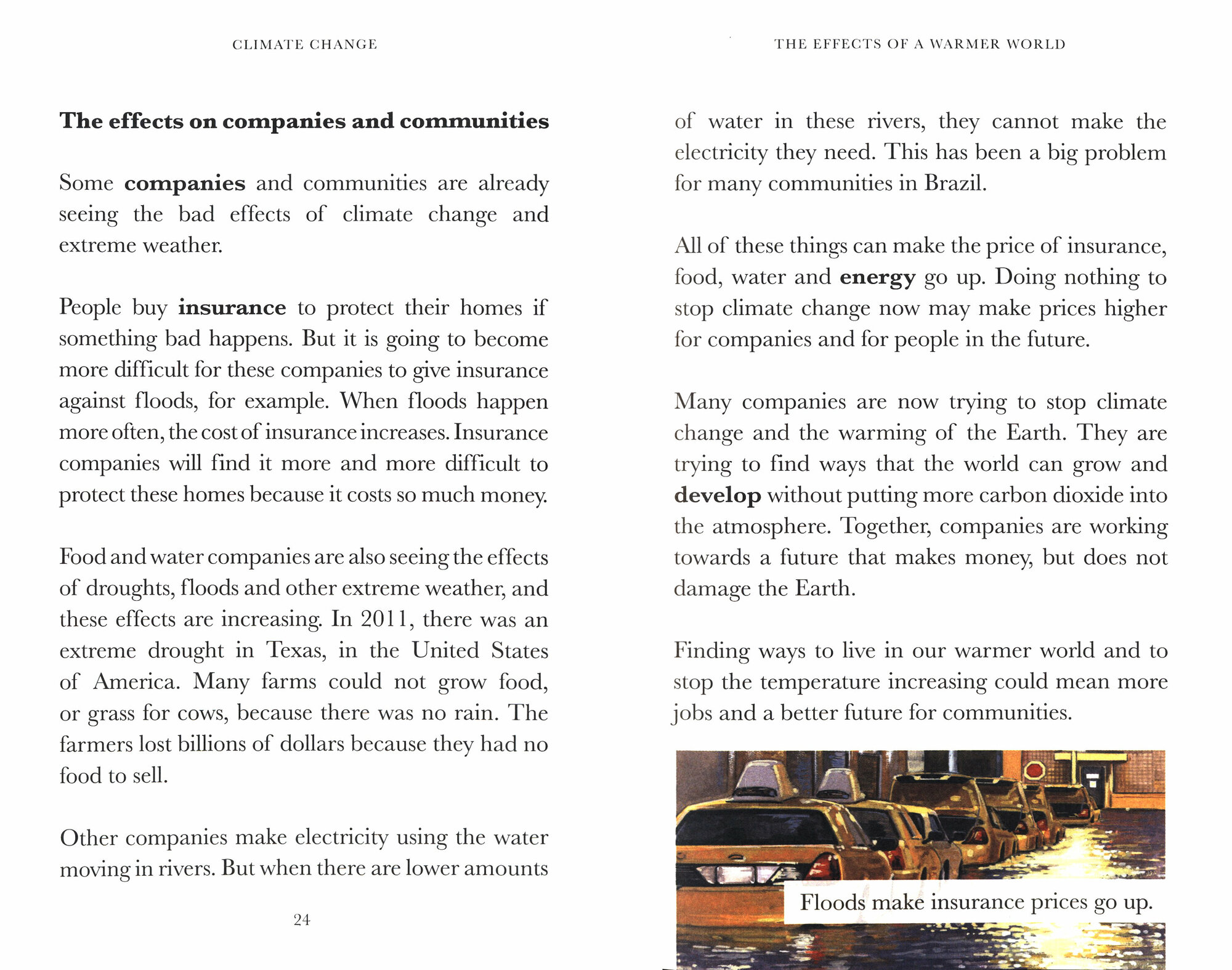 Climate Change, a Level 3 Reader, is A2 in the CEFR framework. The text is made up of sentences with up to three clauses, introducing first conditional, past continuous and present perfect simple for general experience. It is well supported by illustrations, which appear on most pages.