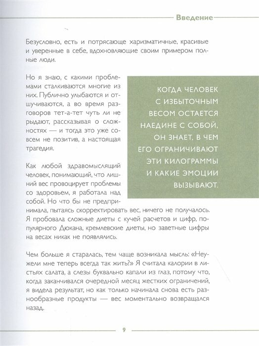 Моя проблема была в том, что я очень люблю есть: именно сам процесс еды заряжал меня позитивом, и когда на диете предлагают питаться горсточкой семян и листиком салата - ээээх. В этой книге все наоборот: вкусно, много, приятно, рецепты в книге отличные, доступные, не по-ресторанному сложные и дорогие. Я пока что в процессе похудения по этой книге, может быть спустя время напишу еще и о результатах. Пока все идет спокойно.