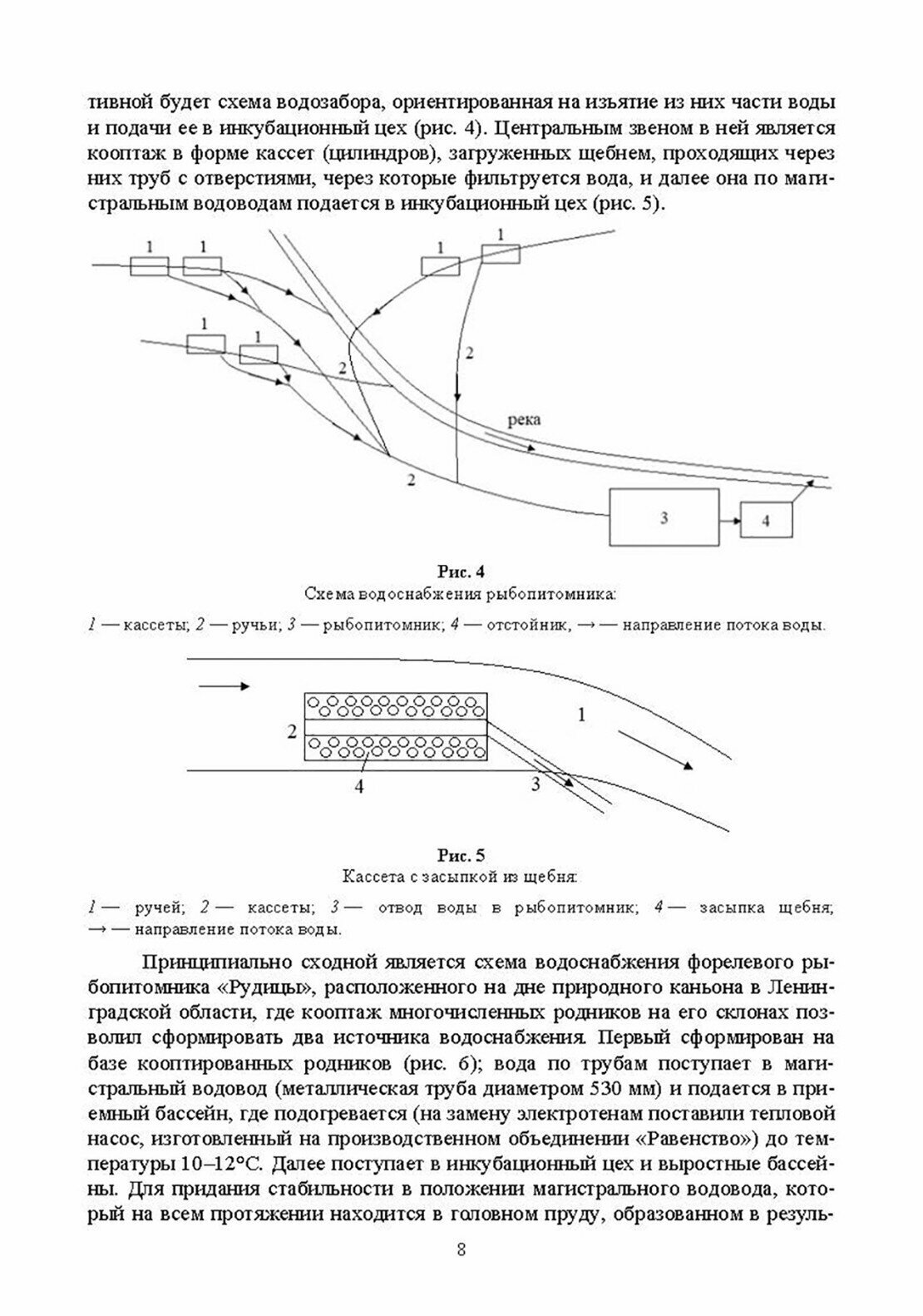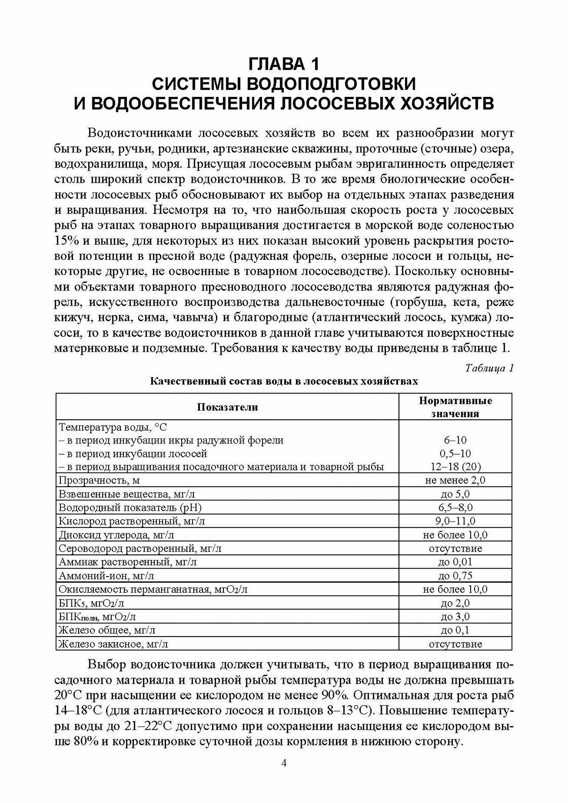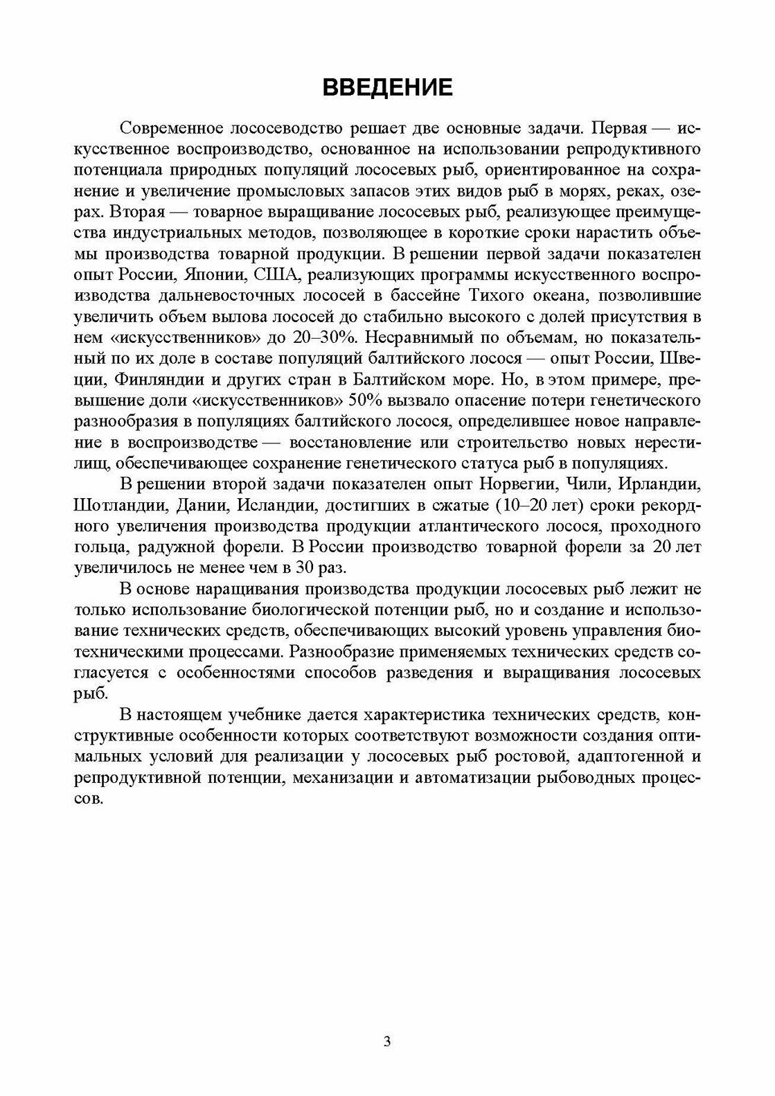 В книге рассматриваются системы водоподготовки и водоснабжения лососевых хозяйств, классифицированных на рыбопитомнике, товарные хозяйства, установки замкнутого водоснабжения (УЗВ). Системы водоподготовки и водообеспечения рассматриваются с позиции использования технических средств, обеспечивающих необходимое качество воды, подаваемой в рыбоводные системы и выходящей из них; технические средства, используемые для содержания производителей, инкубации икры, выдерживания предличинок, выращивания личинок и молоди, а также при товарном выращивании лососевых, а также сортировальные устройства, кормораздатчики и др. Дана техническая характеристика узлов УЗВ, обеспечивающих условия для разведения и выращивания рыбы, механической и биологической фильтрации воды, обеззараживание и оксигенация воды. Представлена характеристика к техническому обеспечению процесса транспортировки оплодотворённой икры, молоди, товарной рыбы. В конце каждой главы предлагаются вопросы для самопроверки. В конце книги дается глоссарий и список рекомендуемой литературы.