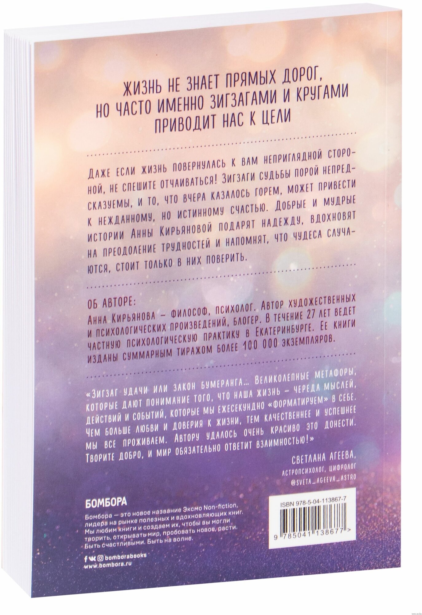 Последняя книга философа, психолога и астролога Анны Валентиновны Кирьяновой, которую я купила : "Зигзаг судьбы. Истории, которые дарят надежду". Жизнь преподносит подчас много неприятностей. Мы в отчаянии. Прочитайте эту книгу и вы получите надежду, что всё сложится хорошо, что после невзгод придут радости. А вообще советую приобрести все книги Анны Кирьяновой. Вы не пожалеете. Будете читать и перечитывать. Я жду новых книг автора. Мне приятно, что я живу в одном городе с Анной Валентиновной.