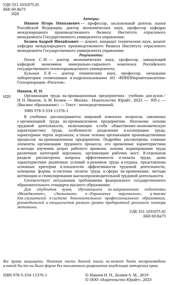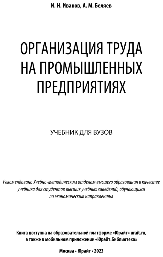 Организация труда на промышленных предприятиях. Учебник для вузов (Иванов Игорь Николаевич; Беляев Андрей Михайлович); ЮРАЙТ, 2019