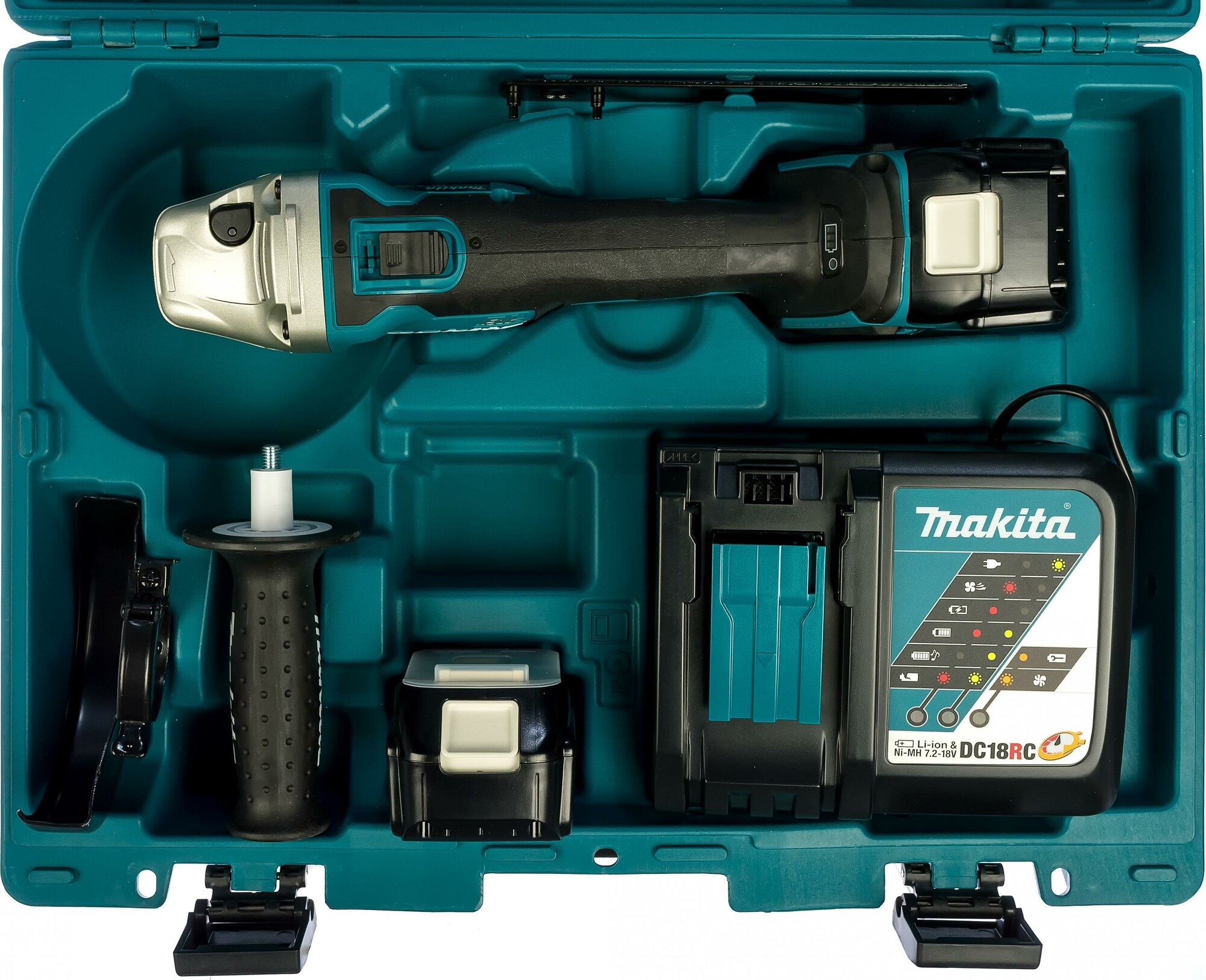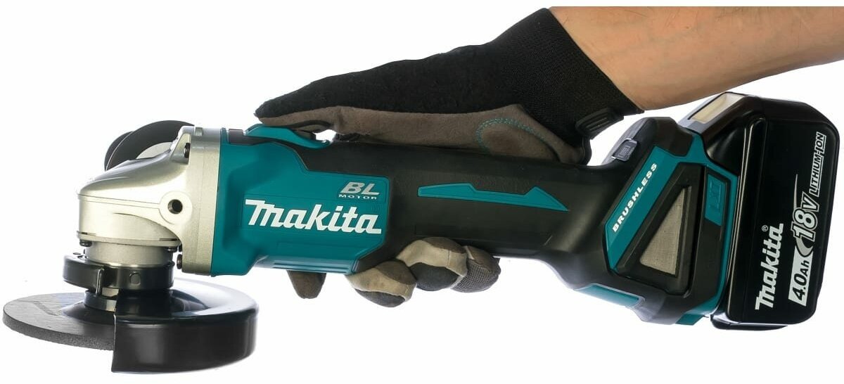 Угловая шлифмашина Makita — эргономичный электроинструмент высокой мощности. Безопасность эксплуатации обеспечена обрезиненной рукояткой. Кожух способствует защите оператора от искр и пыли. В комплекте поставки зарядное устройство и два литий-ионных аккумулятора.