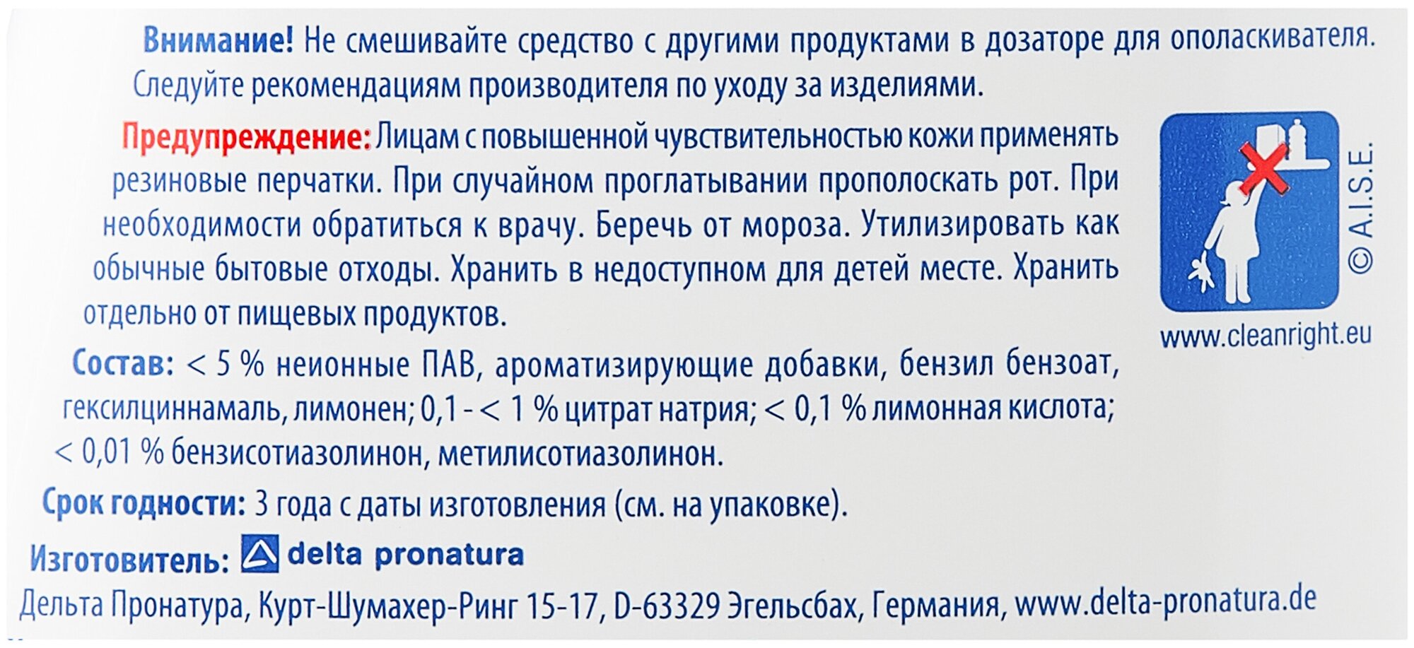 | Химический состав | <5% неионные ПАВ, ароматизирующие добавки, бензил бензоат, гексилциннамаль, лимонен, 0.1-<1% нитрат натрия, <0.1% лимонная кислота, < 0.01% бензисотиазолинон, метилисотиазолинон |
