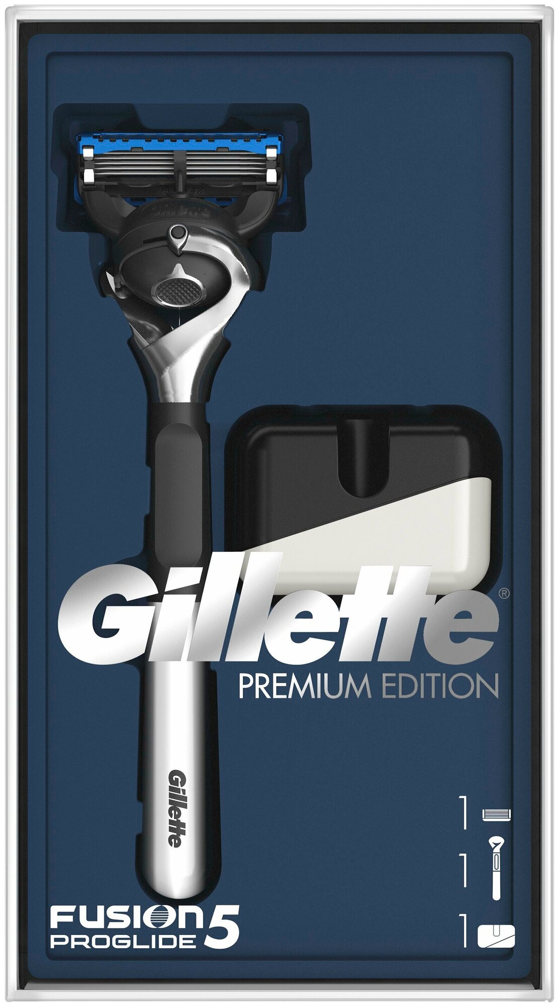 Сделайте ему подарок, который он оценит: подарочный набор Gillette выпуска Limited! В набор входят бритва Fusion5 ProGlide с хромированной ручкой и подставка. Бритва оснащена технологией FlexBall, 5 лезвиями для меньшего трения, смазывающей полоской и точным триммером.